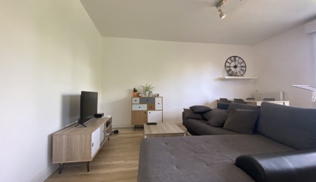 Il se compose d’une entrée avec de nombreux rangements, d’une cuisine aménagée et équipée (plaque de cuisson gaz, hotte, four, lave-vaisselle, micro-ondes, réfrigérateur) ouverte sur un salon-séjour lumineux avec accès à un balcon.