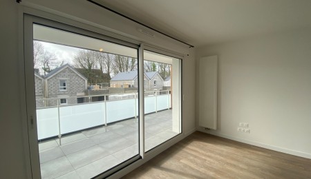À louer – Libre immédiatement – Quimper. Idéalement situé à proximité des commerces (Centre commerciale Intermarché) et desservi par le réseau de bus, cet agréable appartement entièrement NEUF de 43 m² exposé plein SUD, vous séduira par son confort et sa fonctionnalité. Il se trouve au 1er étage d’une résidence neuve, calme et sécurisée, offrant un cadre de vie pratique et serein. L’appartement se compose d’une entrée fonctionnelle avec placard, d’un lumineux salon séjour ouvrant sur une grande terrasse de 14 m², idéale pour profiter des beaux jours. La cuisine, aménagée et équipée (plaque de cuisson à induction, hotte, four, emplacement pour lave-vaisselle), s’intègre harmonieusement à la pièce de vie. L’espace nuit comprend une chambre confortable avec accès direct à la terrasse. Vous trouverez également une salle d’eau moderne (douche, lavabo et emplacement pour machine à laver) ainsi qu’un WC séparé. Un garage privatif de 20 m², vient compléter les prestations de ce bien rare sur le marché locatif.