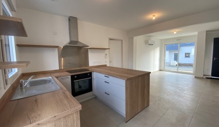 A LOUER. Disponible à partir de début Février. Quimper, Quartier Résidentiel et Familial. Cette Maison Neuve, vous offre une vie de plein pied, au rez-de-chaussée : une cuisine A/E (plaque de cuisson, hotte, four) ouverte sur le salon séjour donnant accès à une terrasses avec de belles expositions. Deux chambre, une salle d’eau et un wc séparé. A l’étage, vous trouverez, deux chambres également, une salle de bain avec baignoire, pour le bonheur des petits et des grands. Une buanderie, un garage complètement les prestations. Un jardin. Vous pouvez vous stationner devant la maison.