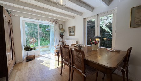 Située au cœur du Centre-Ville de Pont-Aven, à proximité des galeries d’art et des ruelles pittoresques, venez à la découverte de cette charismatique et qualitative maison de maître datant de la fin du XIXe siècle qui à conservé ses éléments d’antan (boiseries, moulures, parquet massif, cheminées..). L’entrée du rez-de-chaussée s’ouvre sur un séduisant salon-séjour sur parquet avec cuisine ouverte A/E à l’exposition parfaite communiquant au sud sur une large terrasse en bois.. Une indispensable et confortable chambre de 22 m² et une salle de bains pour une vie de plain-pied complètent ce niveau. Possibilité d’une activité libérale.