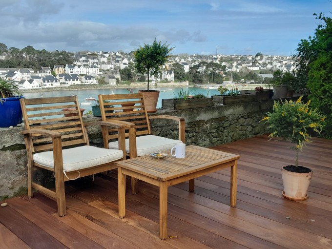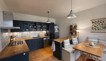 Exclusivité Agence. Audierne – Située dans une ruelle calme sur les hauteurs du port d’Audierne, cette maison des années 1930 de 120 m², entièrement rénovée avec soin, offre un cadre de vie rare et privilégié, sublimé par une vue imprenable et dominante sur le port. Dès l’entrée, vous découvrez une chaleureuse pièce de vie agrémentée d’un poêle à bois Godin, apportant charme et authenticité. Sur l’autre versant, une cuisine conviviale avec espace repas invite aux moments de partage. À ce même niveau, une porte s’ouvre sur un jardin sans vis-à-vis avec terrasse surplombant le port, véritable tableau vivant au fil des marées. Un superbe escalier d’époque mène au premier étage, où se déploient deux chambres aux volumes généreux, séparées par une élégante salle d’eau avec WC. Le deuxième étage accueille deux chambres supplémentaires ainsi qu’une salle d’eau avec WC, idéal pour recevoir famille et amis ou envisager un espace de télétravail. La maison bénéficie également d’un sous-sol complet, atout précieux permettant de nombreux rangements, atelier ou espace annexe. Un bien extrêmement rare sur le secteur !!