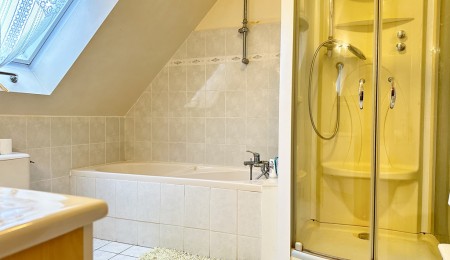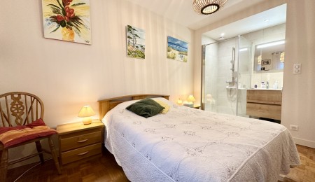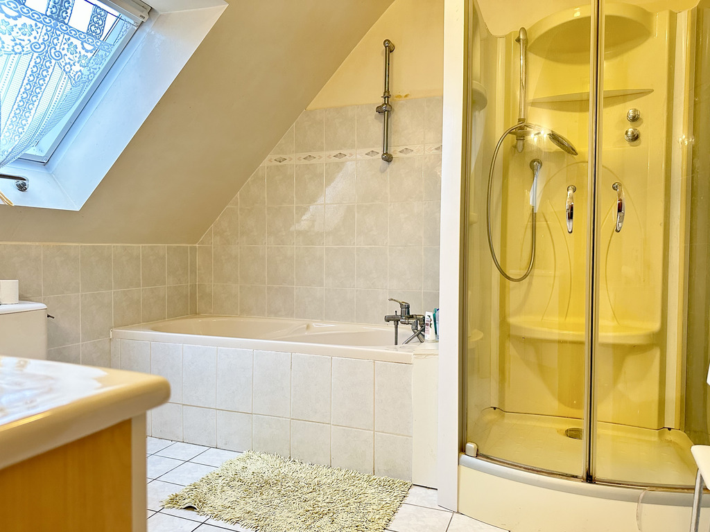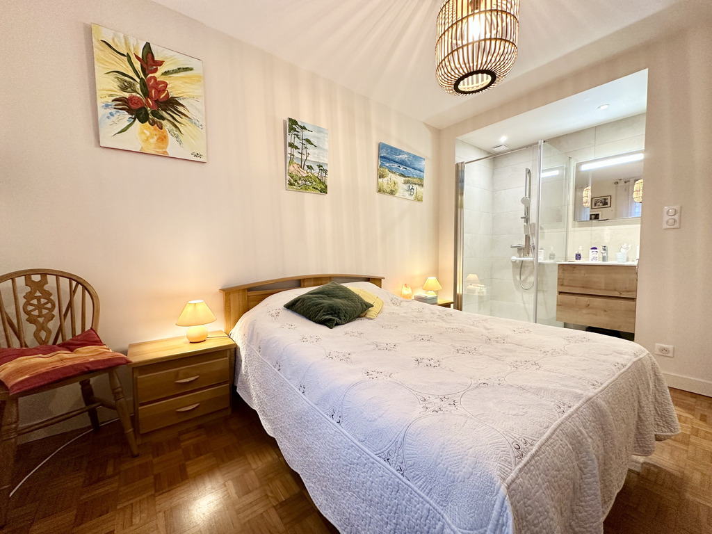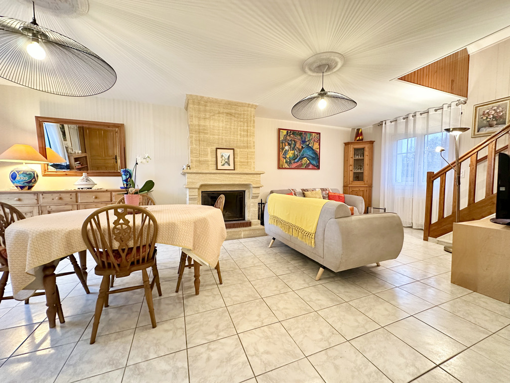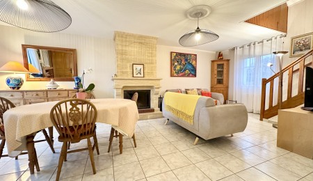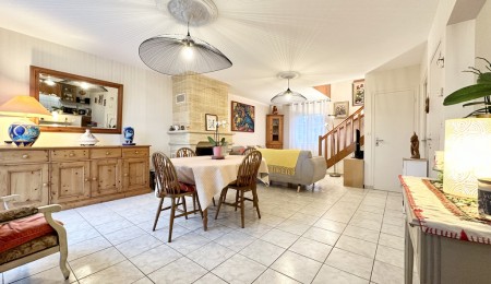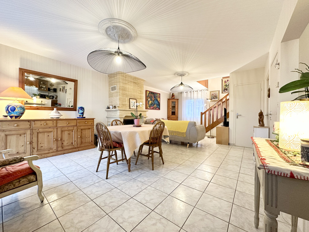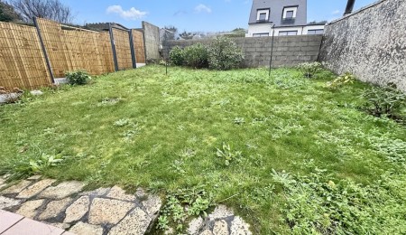 Pour une vie de plain-pied confortable, une chambre avec dressing, salle d’eau et un WC suspendu complètent ce niveau. À l’étage, le palier distribue deux grandes chambres de 15 et 13 m², une salle de bains avec baignoire, douche et WC ainsi qu’un bureau pouvant faire office de quatrième chambre. À l’arrière, le jardin, entièrement abrité, offre un espace intime et agréable pour profiter des beaux jours en toute sérénité.