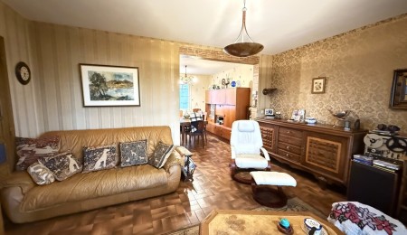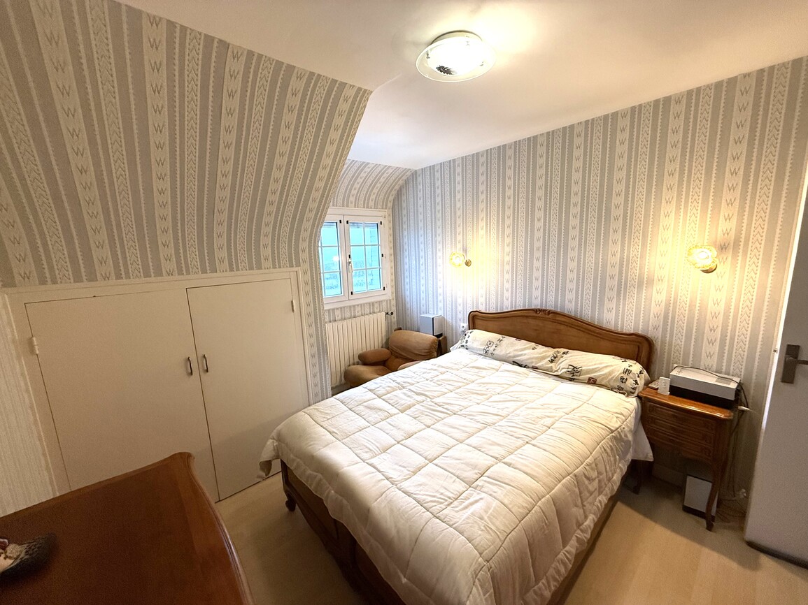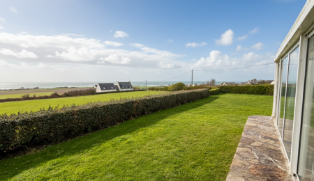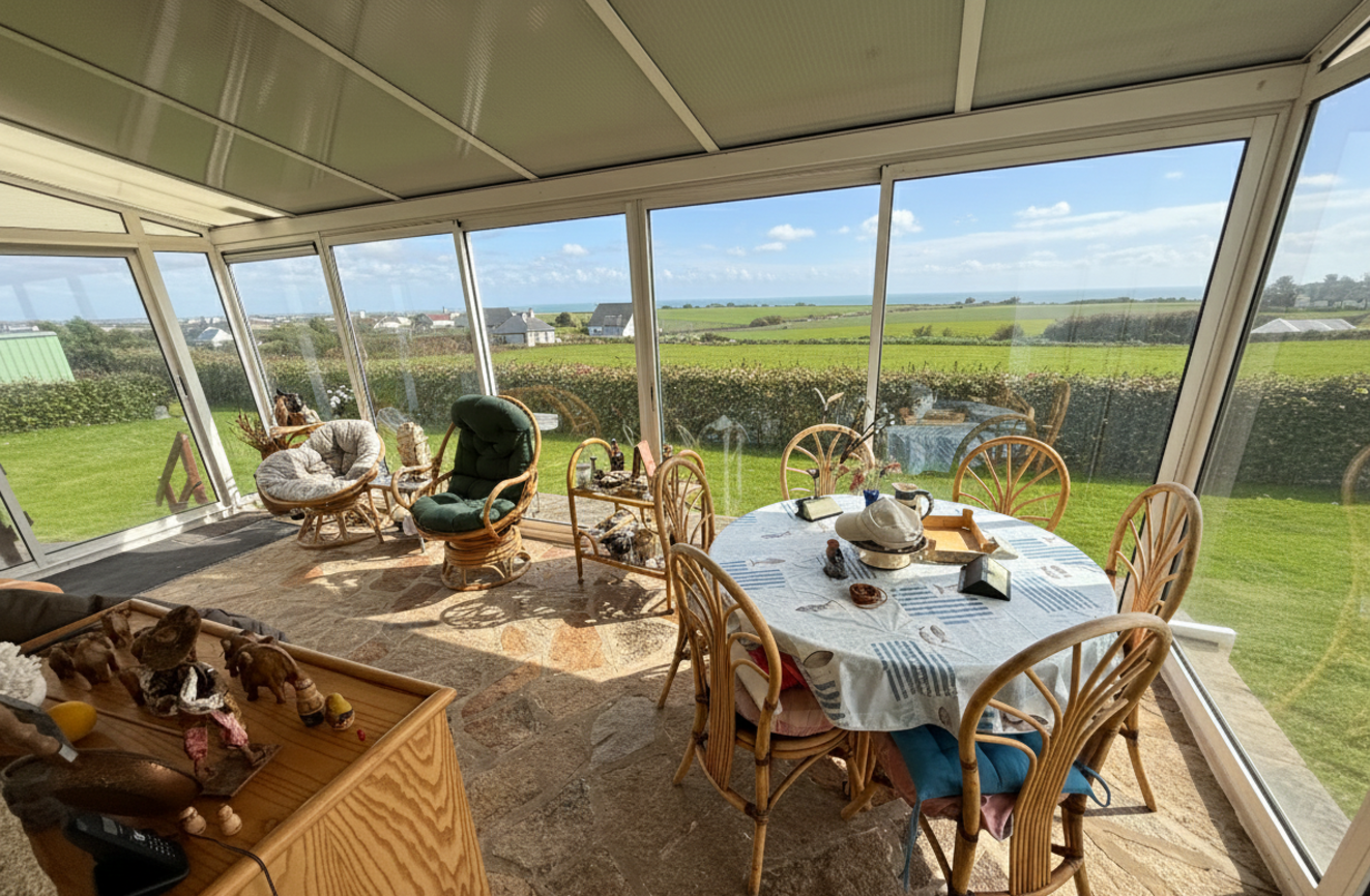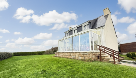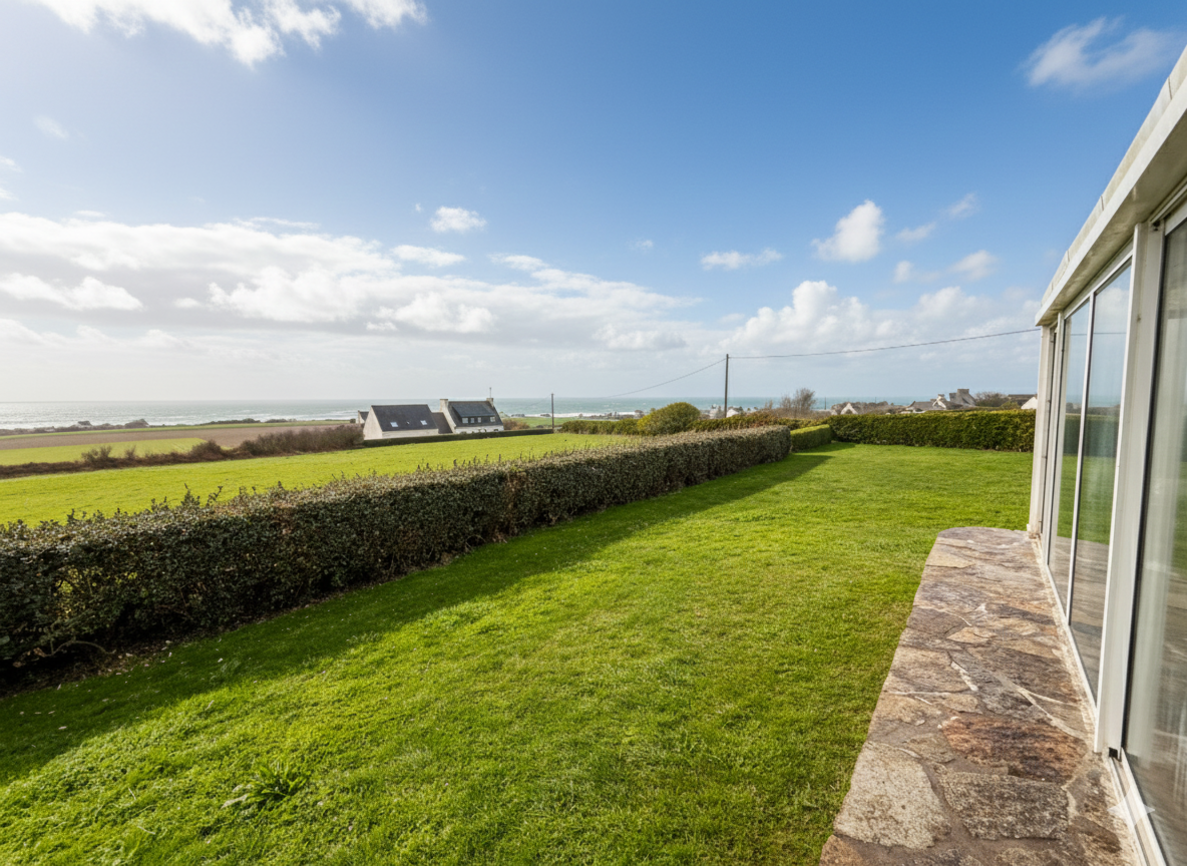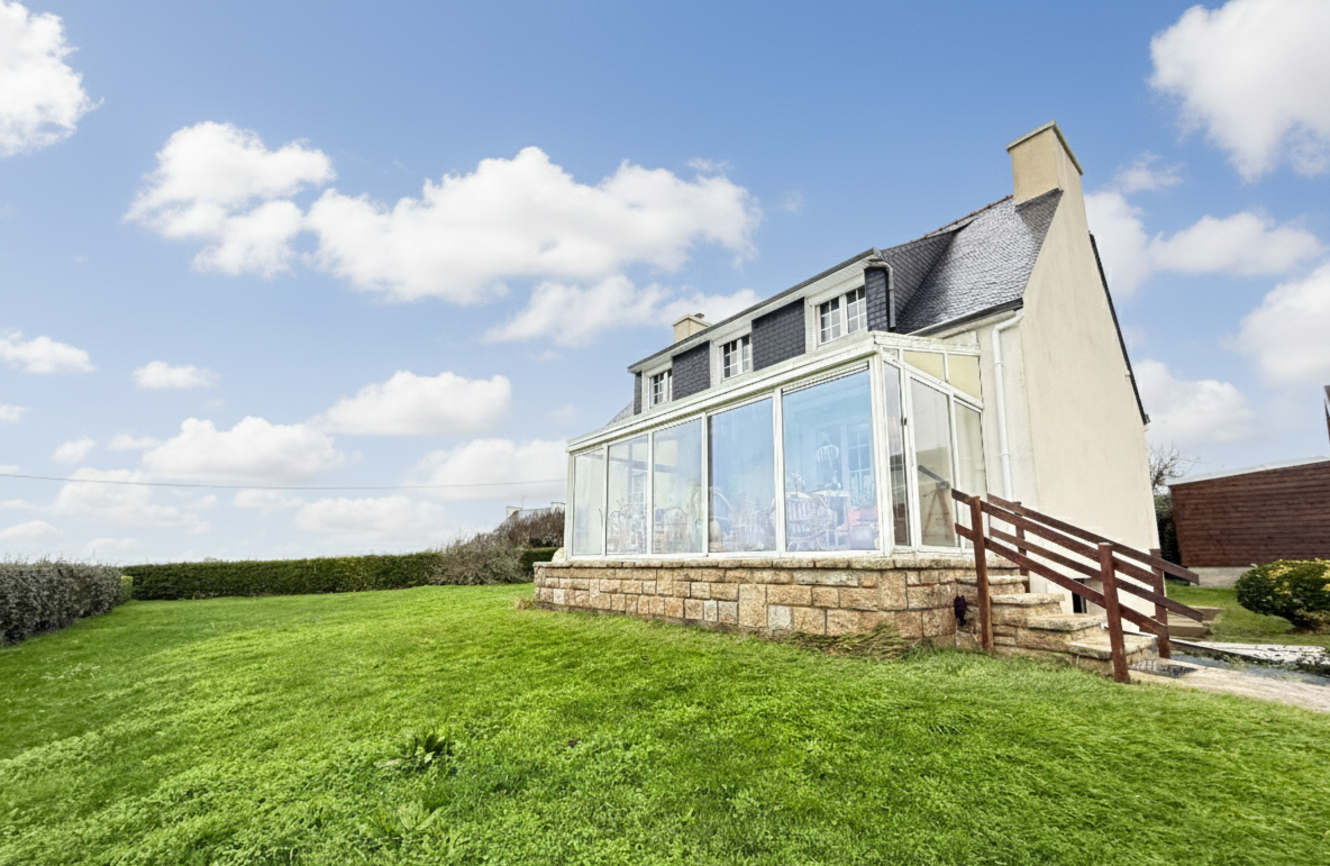 Elle se compose d’une véranda avec vue sur la mer et la campagne, une cuisine aménagée et équipée, un salon-séjour baigné de lumière. Une chambre, un wc et une douche complètent le rez-de-chaussée, tandis que l’étage accueille trois chambres et un bureau, tous tournés vers l’océan. Les volumes, typiques des maisons des années 70, sont à repenser. Le sous-sol semi-enterré offre : garage, buanderie, garde-manger, atelier ou espace de vie additionnel. À l’extérieur, le jardin plat, facile à entretenir, accompagne la maison sur une parcelle généreuse d’environ 1 540 m². Un garage indépendant neuf de 30 m² complète l’ensemble, idéal pour un second véhicule ou du stockage nautique.
