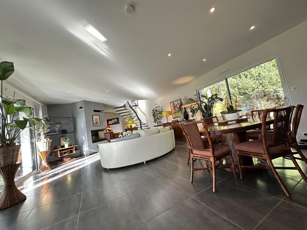 Nichée dans un environnement paisible et verdoyant, cette maison contemporaine de 217 m² conjugue confort, volume et raffinement. Dès l’entrée, le ton est donné : une superbe suite parentale en rez-de-chaussée, pensée comme un véritable espace bien-être, avec dressing sur mesure, salle de bain privative, douche italienne et jacuzzi. L’espace de vie, vaste et baigné de lumière, s’articule autour d’un salon chaleureux avec cheminée moderne et d’une cuisine ouverte, conviviale et élégante. Ces deux espaces s’ouvrent sur deux terrasses indépendantes, à l’abri des regards, parfaites pour vos repas d’été ou vos soirées paisibles face à la nature.