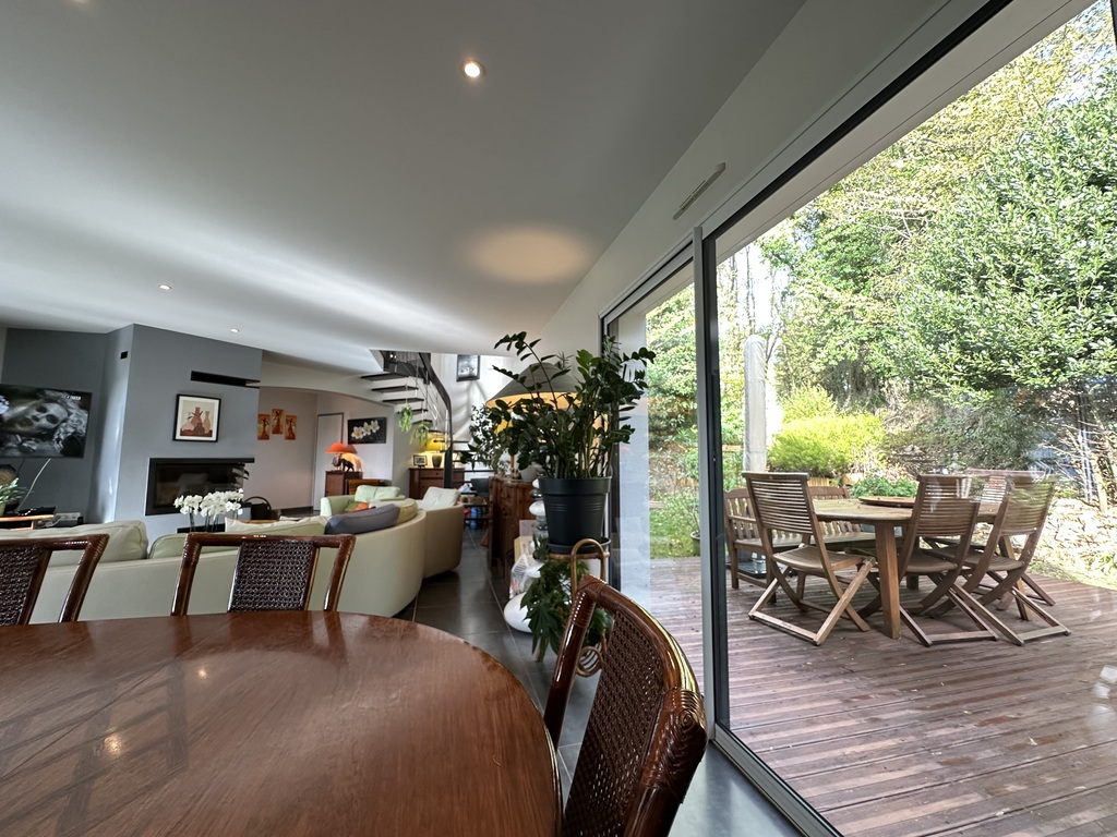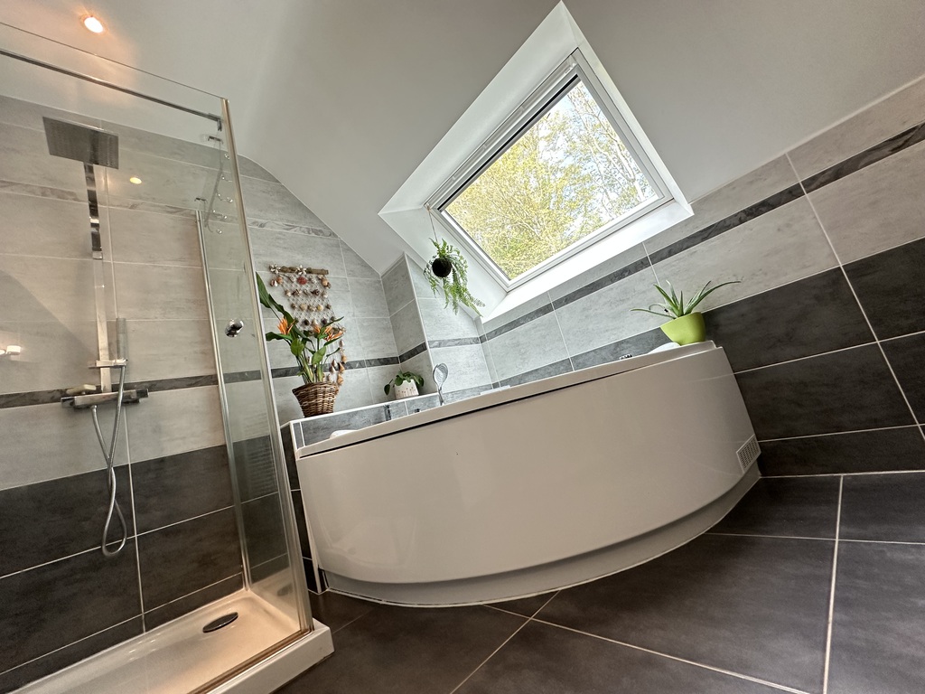 À l’étage, trois grandes chambres, une mezzanine modulable (bureau, coin lecture ou salle de jeux) et une spacieuse salle de bain équipée d’une baignoire jacuzzi et d’une douche viennent compléter ce niveau. Le tout s’inscrit dans un jardin clos et paysagé, sans vis-à-vis, où règnent calme et sérénité. Un grand garage vient parfaire l’ensemble avec son immense grenier aménageable. Une maison familiale d’exception, lumineuse, fonctionnelle et résolument tournée vers le confort et la détente.