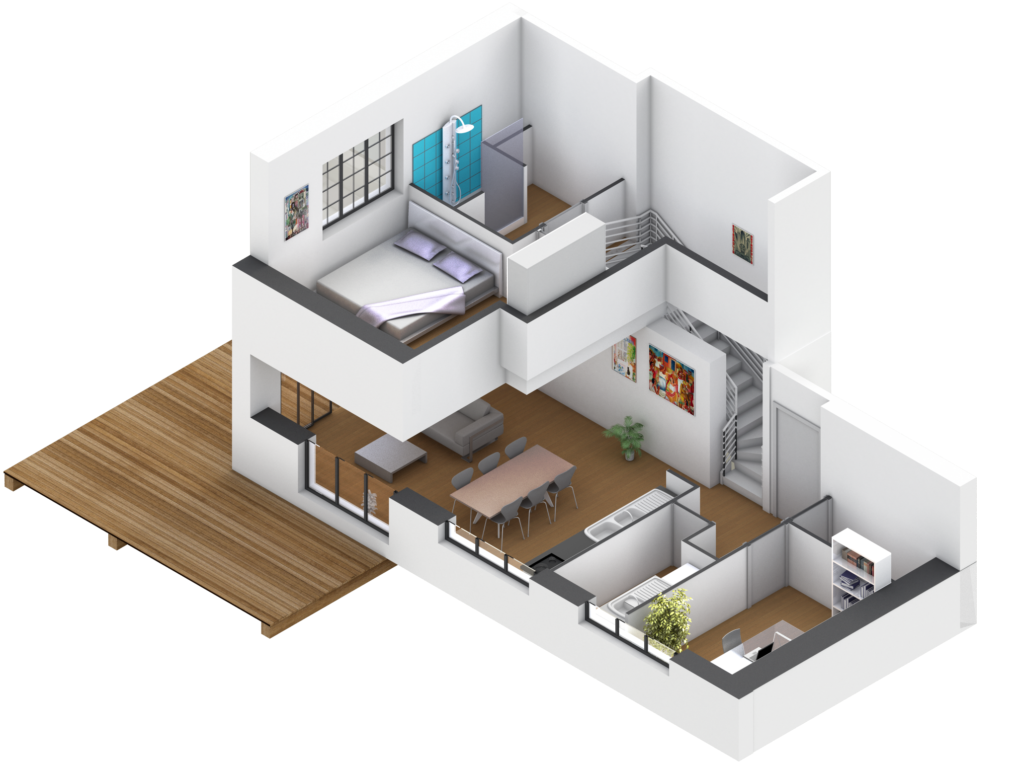 Un cellier indépendant en rez-de-jardin (vélo, stockage) ainsi qu’une place de stationnement extérieure privative.