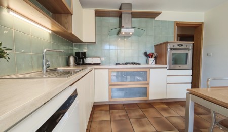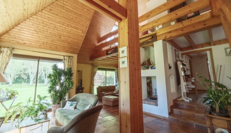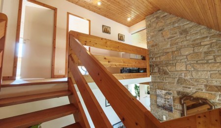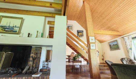 Un escalier bois vous dirige sur une double mezzanine séparée par une cheminée, l’ensemble surplombant le salon-séjour et communiquant sur trois autres chambres, un cellier, salle d’eau et wc. Garage en sous-sol.
