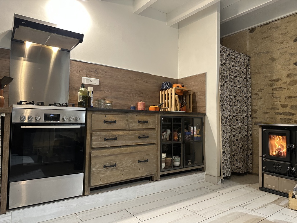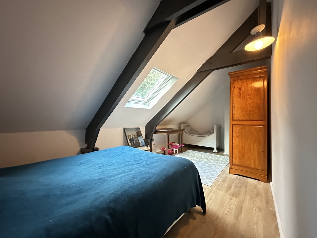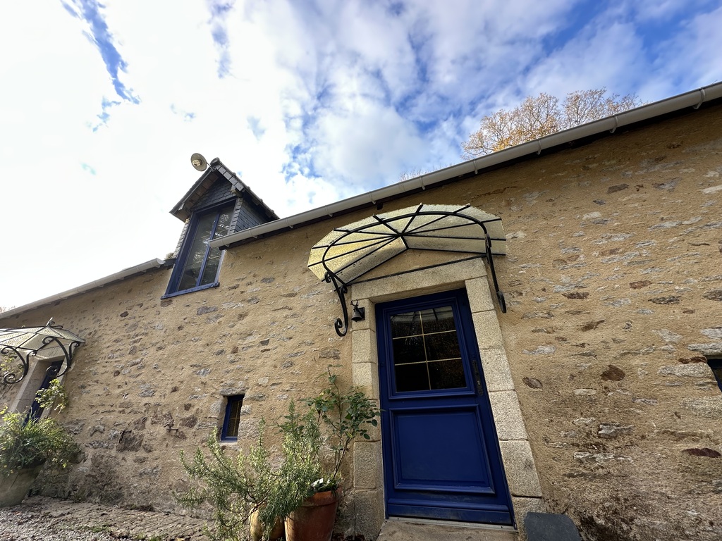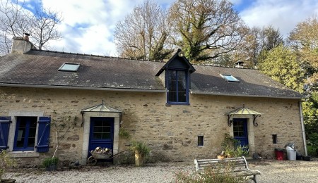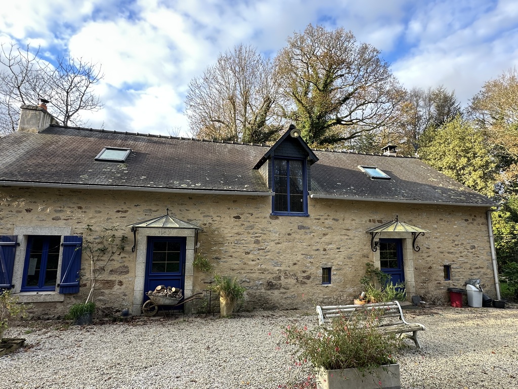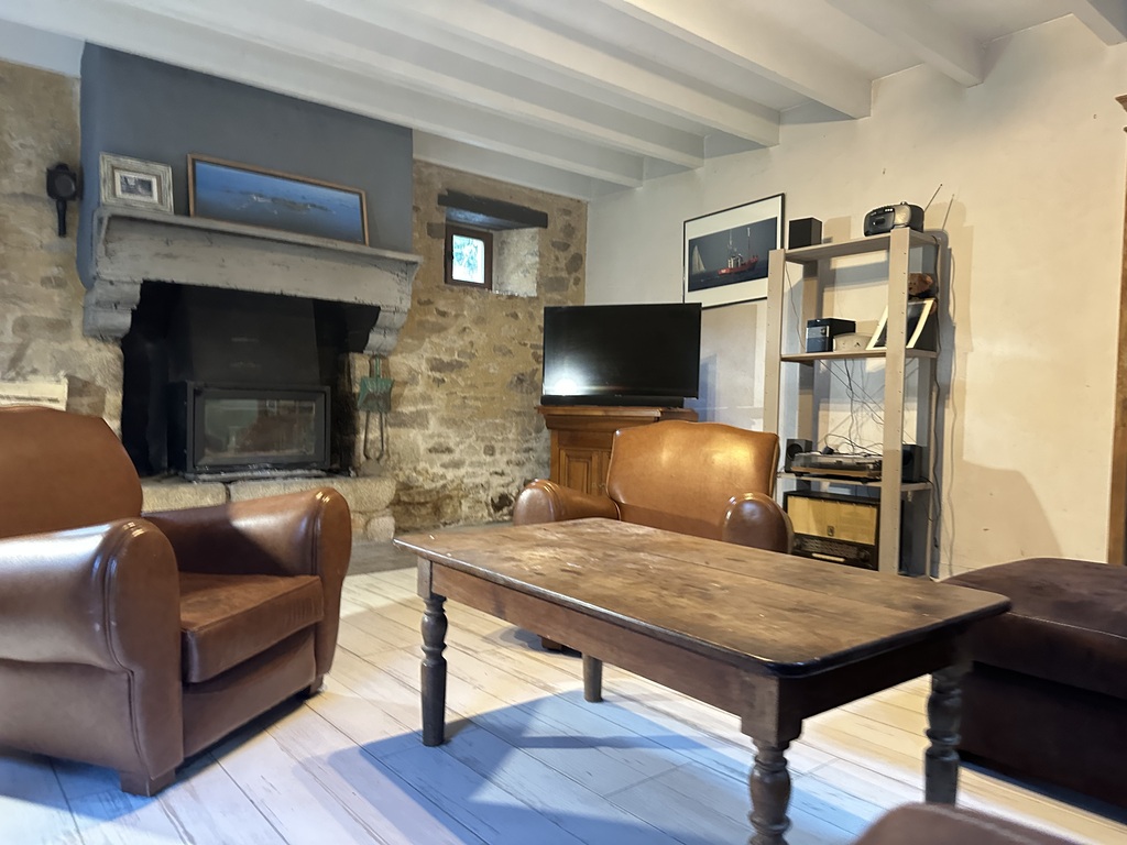 La longère, édifiée en 1891 et rénovée avec respect, offre une atmosphère chaleureuse dès les premiers pas. La pièce de vie, lumineuse et conviviale, s’organise avec imposante cheminée en pierre équipée d’un insert bois. La cuisine ouverte, aménagée et équipée, profite elle aussi d’un poêle récent, apportant une chaleur douce et continue. L’ensemble forme un espace vivant, authentique, fidèle à l’esprit des maisons de campagne bretonnes.