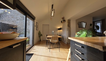 Exclusivité Agence, sur la commune de PONT L’ABBE, Située dans l’hyper Centre Commerçant, découvrez cette rarissime opportunité d’habiter en coeur de ville dans une grande Maison offrant de nombreuses possibilités; Au rez-de-chaussée un local commercial (27m²), un garage avec porte automatisée et une entrée desservant une surface à rénover d’environ 80m² pouvant accueillir une belle pièce de vie donnant sur le jardin clos sans le moindre vis à vis et exposé sud et ouest ou pourquoi pas un Commerce; Le bel escalier dessert aujourd’hui au premier étage un bel appartement bourgeois (119m²) entièrement rénové offrant un séjour avec poêle à pellet et une cuisine aménagée et équipée donnant sur une terrasse ensoleillée, un cellier, une chambre et une salle de bain; Au dernier étage le large palier-bureau dessert 2 chambres dont une avec dressing, une salle d’eau; 2 pièces complémentaires à rénover; Le Magnifique Jardin clos de hauts murs de pierres est un véritable atout avec son palmier et ses camélias anciens. Coup de Coeur assuré pour cette rarissime opportunité d’une Maison de Ville Sans Contraintes!