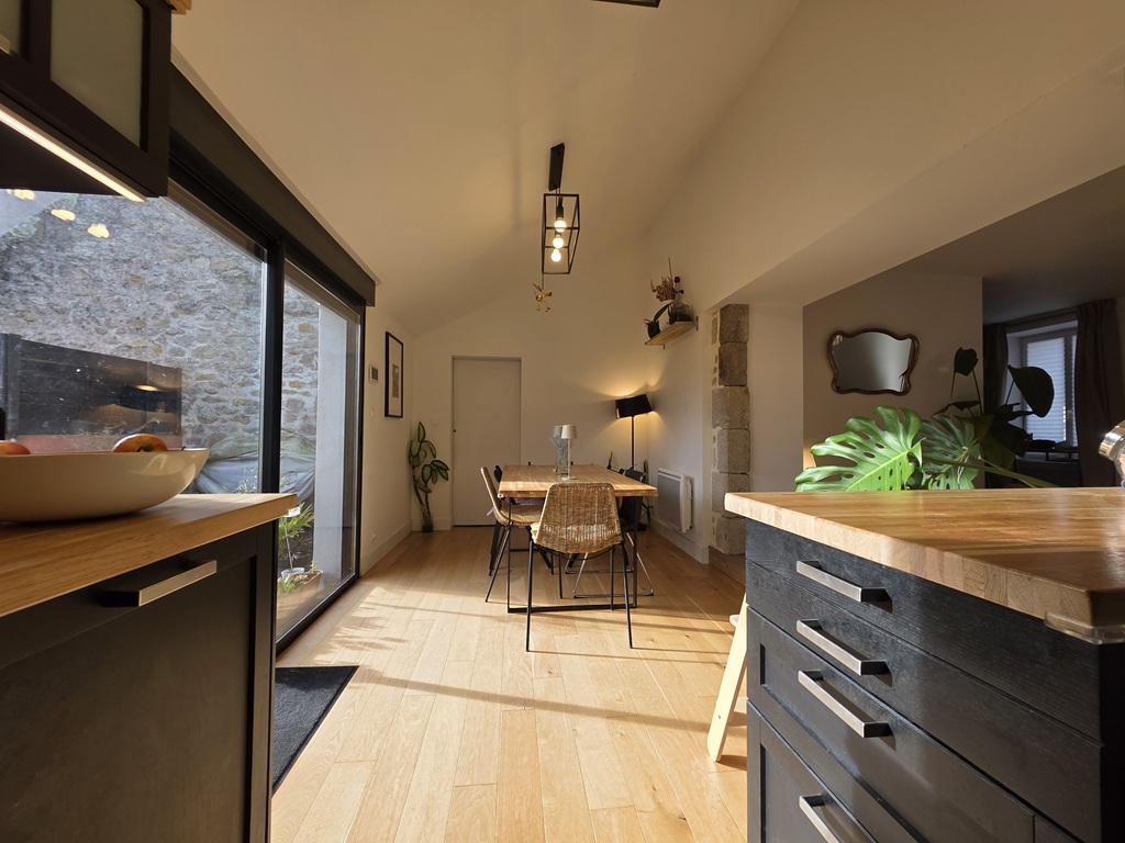 Exclusivité Agence, sur la commune de PONT L’ABBE, Située dans l’hyper Centre Commerçant, découvrez cette rarissime opportunité d’habiter en coeur de ville dans une grande Maison offrant de nombreuses possibilités; Au rez-de-chaussée un local commercial (27m²), un garage avec porte automatisée et une entrée desservant une surface à rénover d’environ 80m² pouvant accueillir une belle pièce de vie donnant sur le jardin clos sans le moindre vis à vis et exposé sud et ouest ou pourquoi pas un Commerce; Le bel escalier dessert aujourd’hui au premier étage un bel appartement bourgeois (119m²) entièrement rénové offrant un séjour avec poêle à pellet et une cuisine aménagée et équipée donnant sur une terrasse ensoleillée, un cellier, une chambre et une salle de bain; Au dernier étage le large palier-bureau dessert 2 chambres dont une avec dressing, une salle d’eau; 2 pièces complémentaires à rénover; Le Magnifique Jardin clos de hauts murs de pierres est un véritable atout avec son palmier et ses camélias anciens. Coup de Coeur assuré pour cette rarissime opportunité d’une Maison de Ville Sans Contraintes!