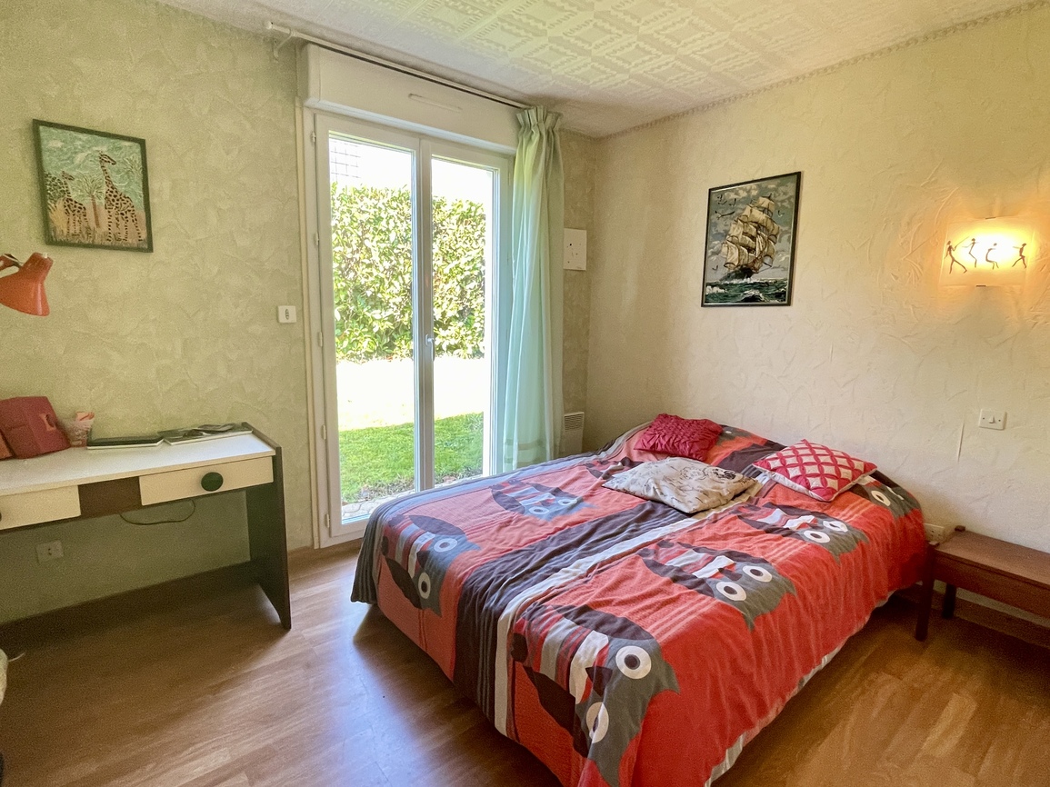 L’entrée distribue une pièce de vie exposée ouest, avec cuisine ouverte et accès direct à la terrasse. Deux chambres se situent au rez-de-chaussée ainsi qu’une salle d’eau indispensable pour une vie de plain-pied, une troisième pièce servant de bureau avec rangements, idéal pour le télétravail et, des w.-c. indépendants complètent ce niveau.