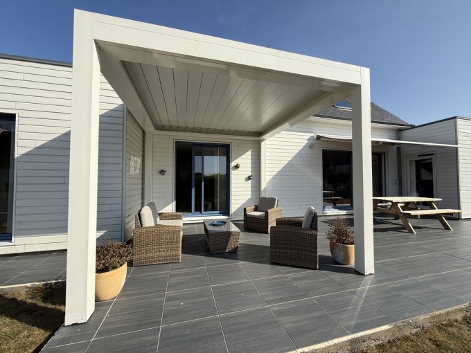 Pays Bigouden- Sur la Commune du Guilvinec – A 900M de la Plage et des Commerces et du Port,Venez découvrir cette magnifique maison contemporaine (2012) édifiée en ossature bois par un constructeur local réputé; Vous serez séduits dès l’entrée par la découverte de cette belle pièce de vie de 50 m² baignée de lumière par ses larges baies vitrées et ouverte sur une cuisine moderne aménagée et équipée ,un poêle à bois pour les soirées hivernales. La maison offre une vie confortable de plain-pied avec deux chambres, un bureau, une salle d’eau, une buanderie; à l’étage : vous trouverez deux chambres supplémentaires ainsi qu’une lingerie et une salle de bain. Le Jardin entièrement clos invite à la détente avec grande terrasse exposée plein sud protégé par un store banne, un abri de jardin pour ranger l’outillage de jardin. Située au calme d’une petite rue dans un quartier recherché, c’est une opportunité rare à ne pas manquer.