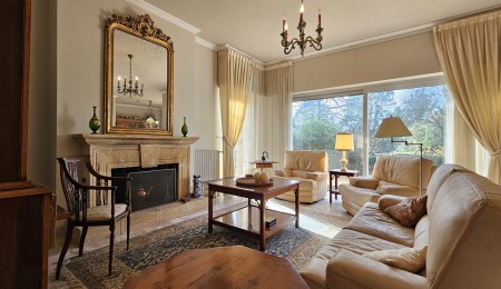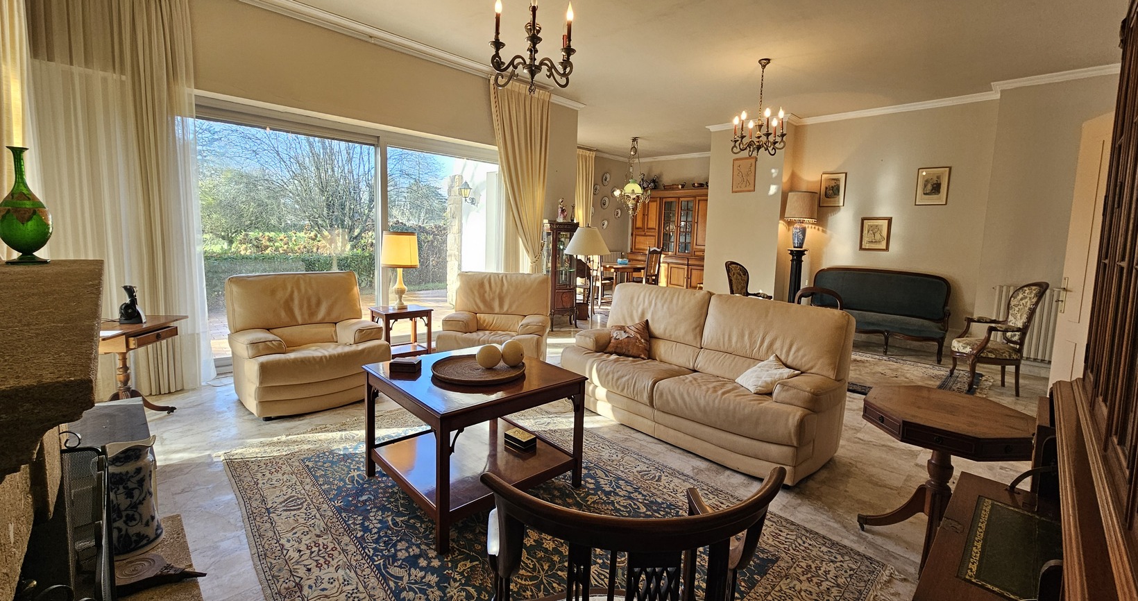 La visite débute par une vaste entrée qui donne immédiatement le ton. Les volumes sont généreux, la hauteur sous plafond de trois mètres sur les deux niveaux accentue la sensation d’espace et la lumière circule librement. La pièce de vie, spacieuse et chaleureuse, s’organise autour d’une cheminée et s’ouvre naturellement vers l’extérieur. La cuisine attenante, aménagée et équipée, offre une belle continuité avec les espaces de réception. Un bureau, un WC séparé ainsi qu’une grande chambre avec salle d’eau complètent ce niveau, permettant une vraie vie de plain-pied.