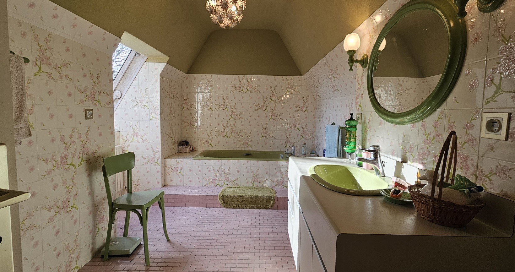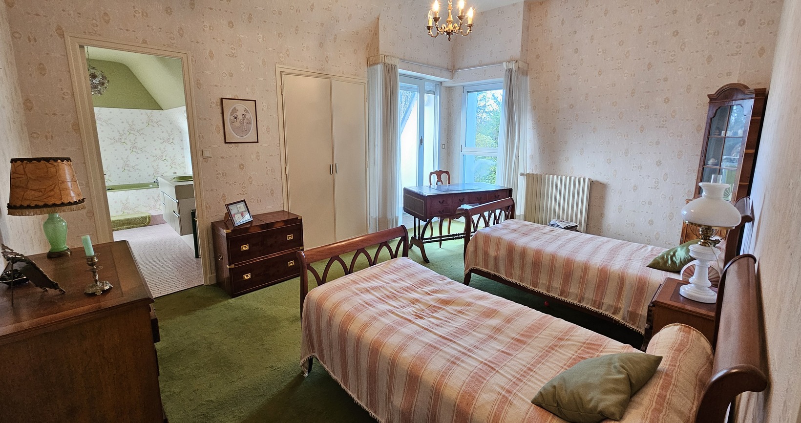 À l’étage, le palier dessert une mezzanine ouverte, idéale pour un espace détente ou bibliothèque. Quatre chambres aux beaux volumes s’y répartissent, accompagnées d’une salle de bain, d’un WC séparé et d’un second bureau, parfait pour le télétravail ou une activité indépendante.