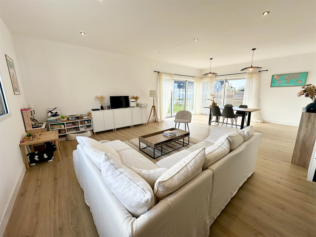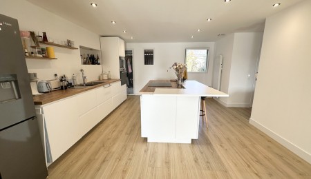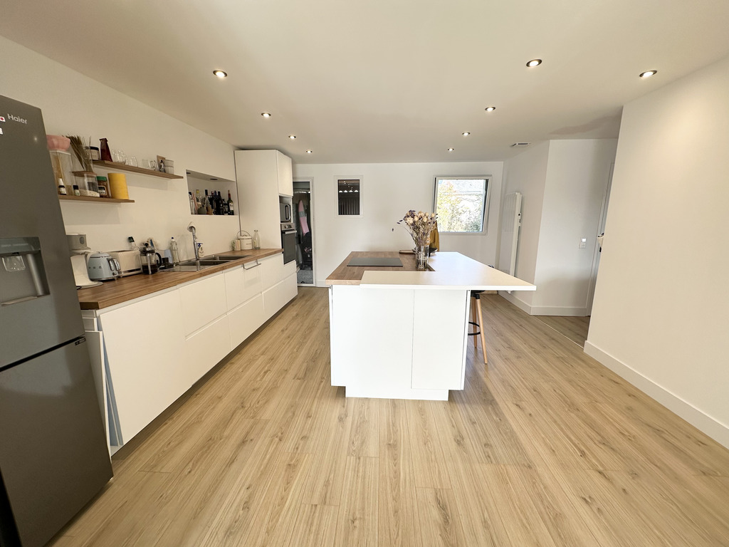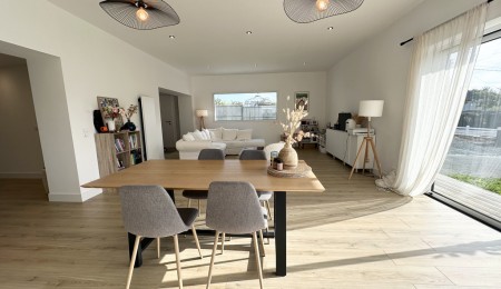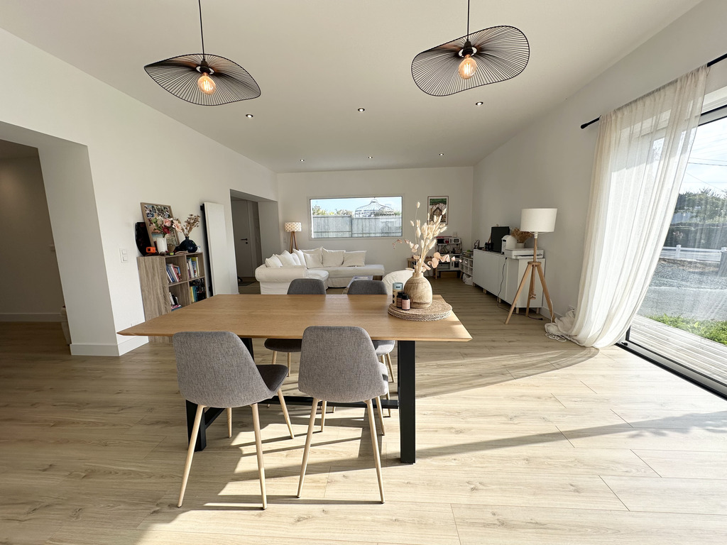 Une surface de 145 m² offrant dès l’entrée une généreuse pièce de vie traversante, baignée de lumière naturelle, pensée pour les moments de partage. Le séjour s’ouvre sur une cuisine attenante, équipée d’un îlot central convivial, parfaite pour les repas en famille ou entre amis. Cette pièce de vie prolonge naturellement vers l’extérieur : une terrasse plein Sud invite à la détente, face à un joli jardin paysagé sur un terrain clos de 530 m².