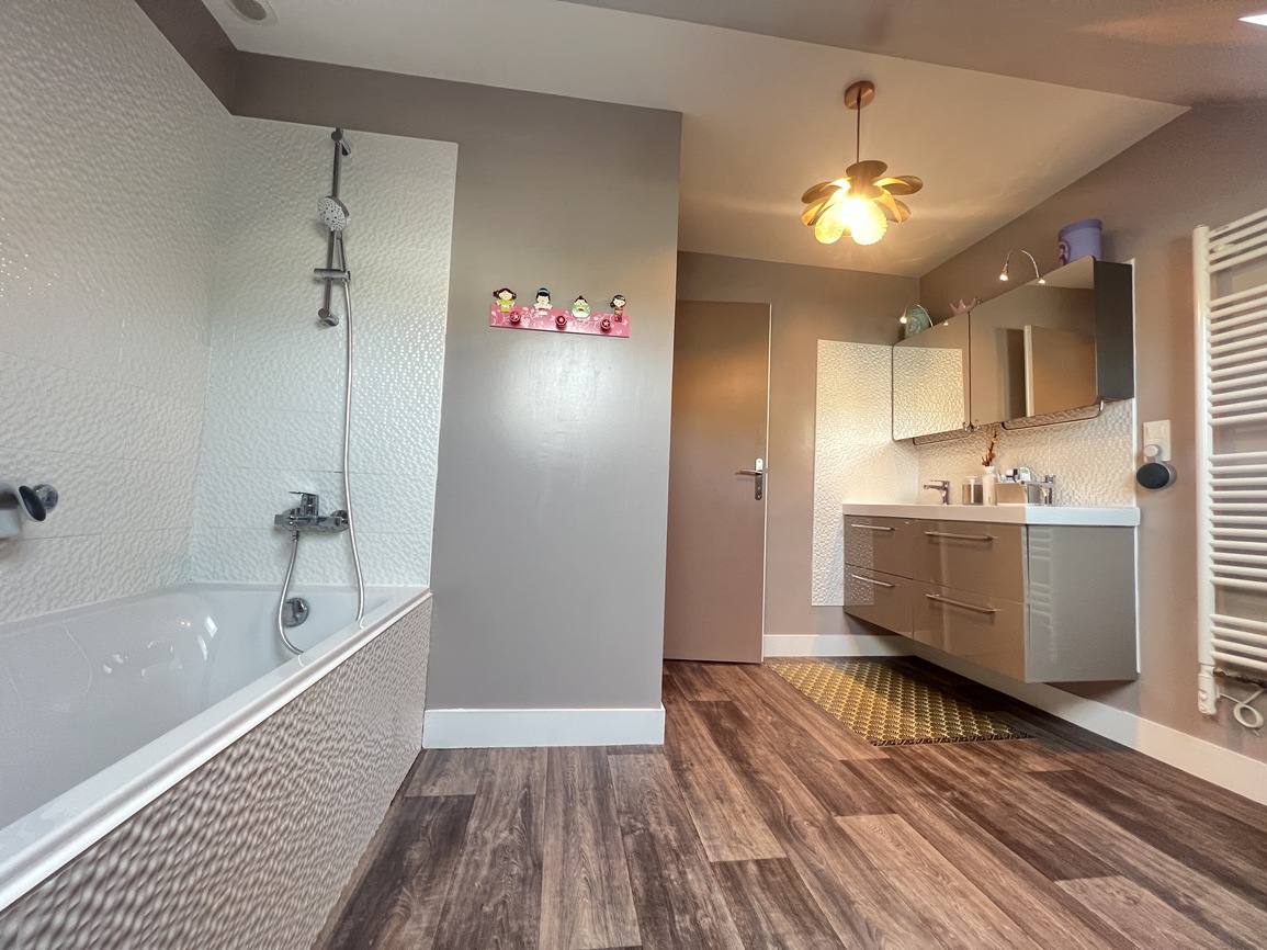 Le premier étage propose une chambres à l’esprit cosy ouverte sur une belle terrasse bois avec un espace buanderie attenant à la chambre, une seconde pièce bureau ou chambre complète ce deuxième niveau de vie avec une jolie salle de bain équipée d’une baignoire et d’une douche, et des placards de rangement.