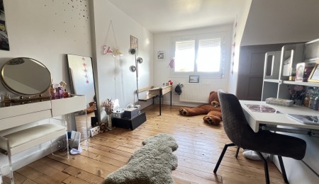 Le deuxième niveau s’ouvre deux chambres lumineuses sur parquet, une salle de bain fonctionnelle .