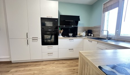 La cuisine aménagée et équipée dispose d’un espace dinatoire fonctionnel et d’un accès direct à une buanderie indépendante.