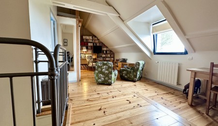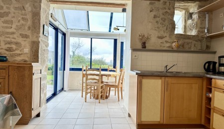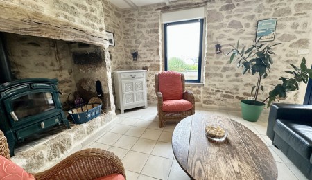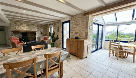 Dès l’entrée, le charme opère, la vaste pièce de vie d’environ 50 m² mêle subtilement caractère et convivialité, offrant un salon chaleureux avec son poêle à bois, souligné par de magnifiques murs en pierres apparentes, une cuisine ouverte accueillante, et une véranda baignée de soleil prolongeant l’espace vers une terrasse plein sud. L’ensemble crée une atmosphère douce et inspirante, idéale pour partager des moments en famille ou entre amis.