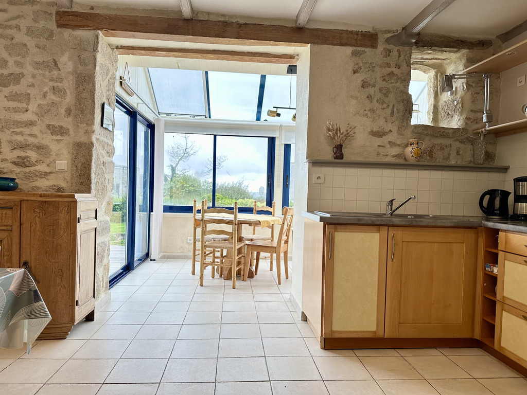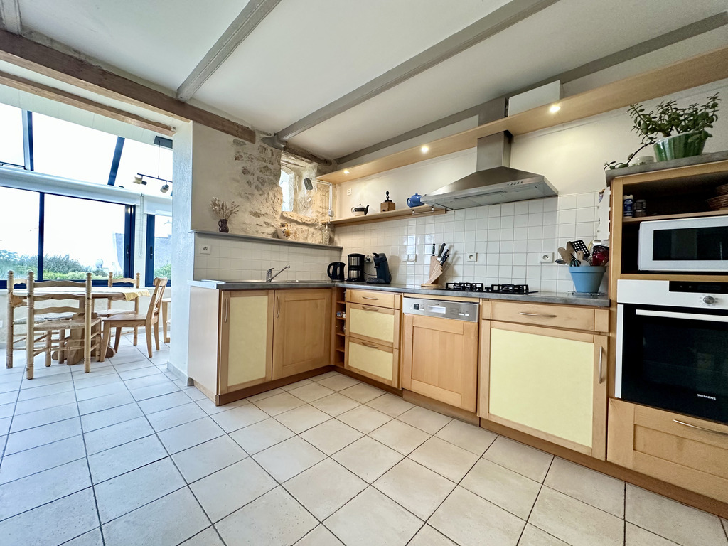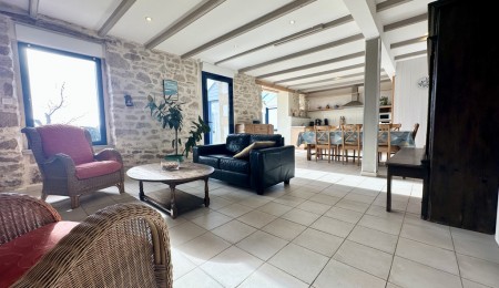 Dès l’entrée, le charme opère, la vaste pièce de vie d’environ 50 m² mêle subtilement caractère et convivialité, offrant un salon chaleureux avec son poêle à bois, souligné par de magnifiques murs en pierres apparentes, une cuisine ouverte accueillante, et une véranda baignée de soleil prolongeant l’espace vers une terrasse plein sud. L’ensemble crée une atmosphère douce et inspirante, idéale pour partager des moments en famille ou entre amis.