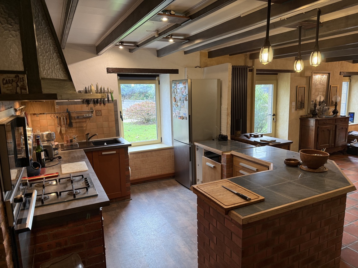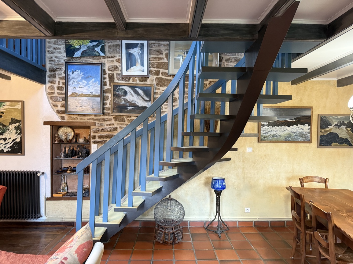 Plouhinec, superbe longère en pierre de 167 m² située au calme d’une impasse, sur un terrain arboré de 1 300 m², à quelques centaines de mètres des commerces et à seulement un kilomètre des plages de sable fin. Cette maison pleine de charme, édifiée en 1909, se trouve sur la commune de Plouhinec, en Finistère Sud, à proximité immédiate de la station balnéaire prisée d’Audierne et à 35 minutes de Quimper. Elle se compose au rez-de-chaussée d’une grande pièce de vie lumineuse réunissant salon, séjour et cuisine aménagée et équipée, d’une chambre avec salle de bain attenante, de WC séparés, d’une buanderie, d’un local chaufferie et d’un garage. À l’étage, au-dessus du garage, un palier dessert une chambre ainsi qu’une salle d’eau avec WC. L’étage principal offre deux belles chambres supplémentaires, une grande mezzanine idéale pour un bureau ou un atelier, ainsi qu’une autre salle d’eau avec WC. La maison a été rénovée dans les années 1980-1990 et a toujours été soigneusement entretenue. Le terrain, sans vis-à-vis, est magnifiquement arboré et dispose d’une citerne de 13 m³ pour la récupération des eaux de pluie, idéale pour l’arrosage du jardin. Ce bien rare, alliant charme, tranquillité et proximité du littoral, constitue un cadre de vie idéal en résidence principale comme en maison de vacances.