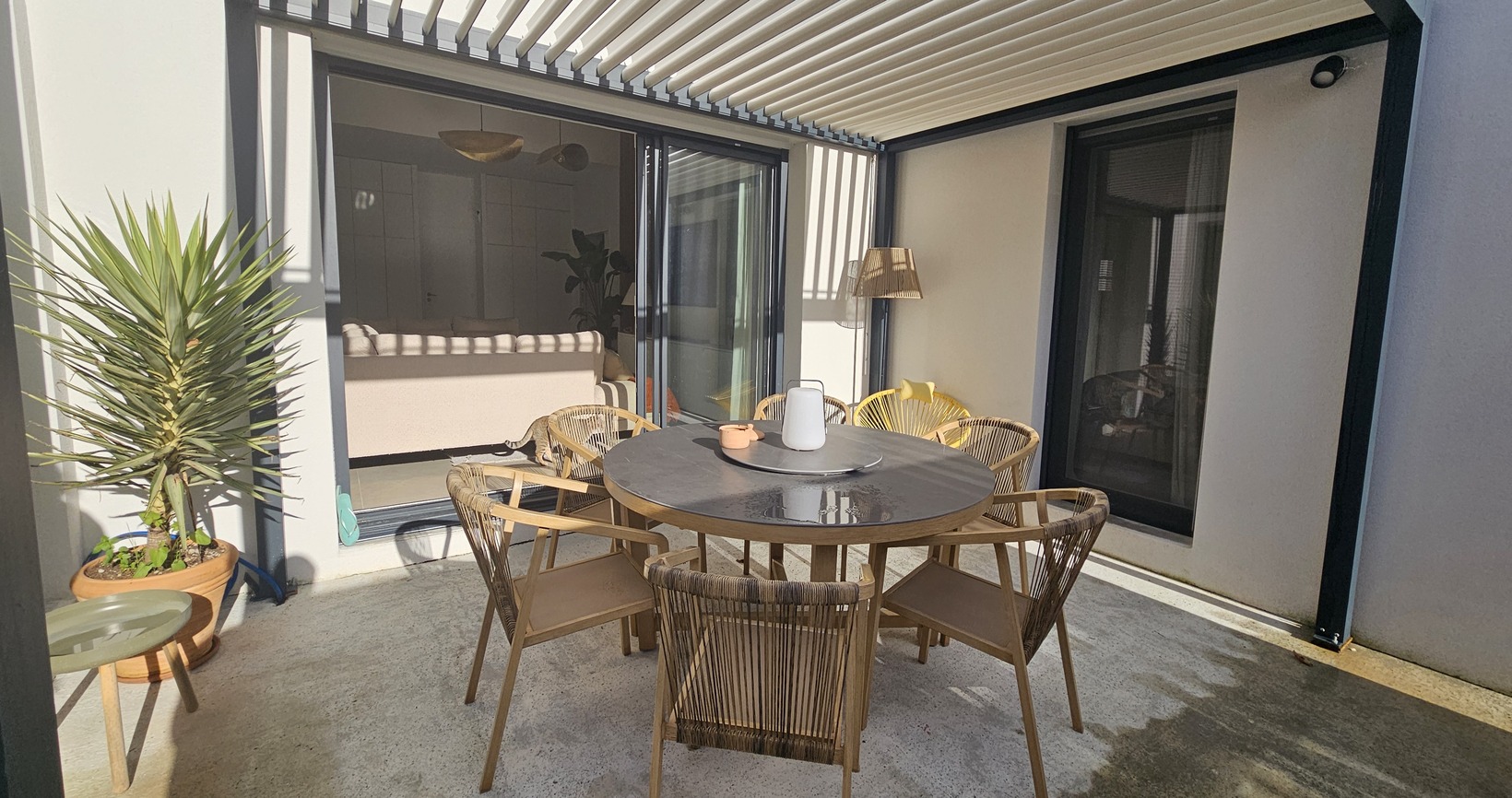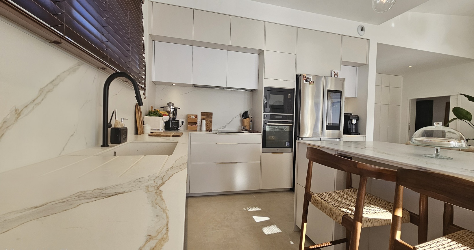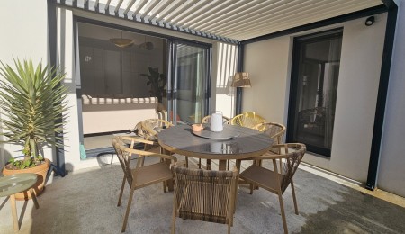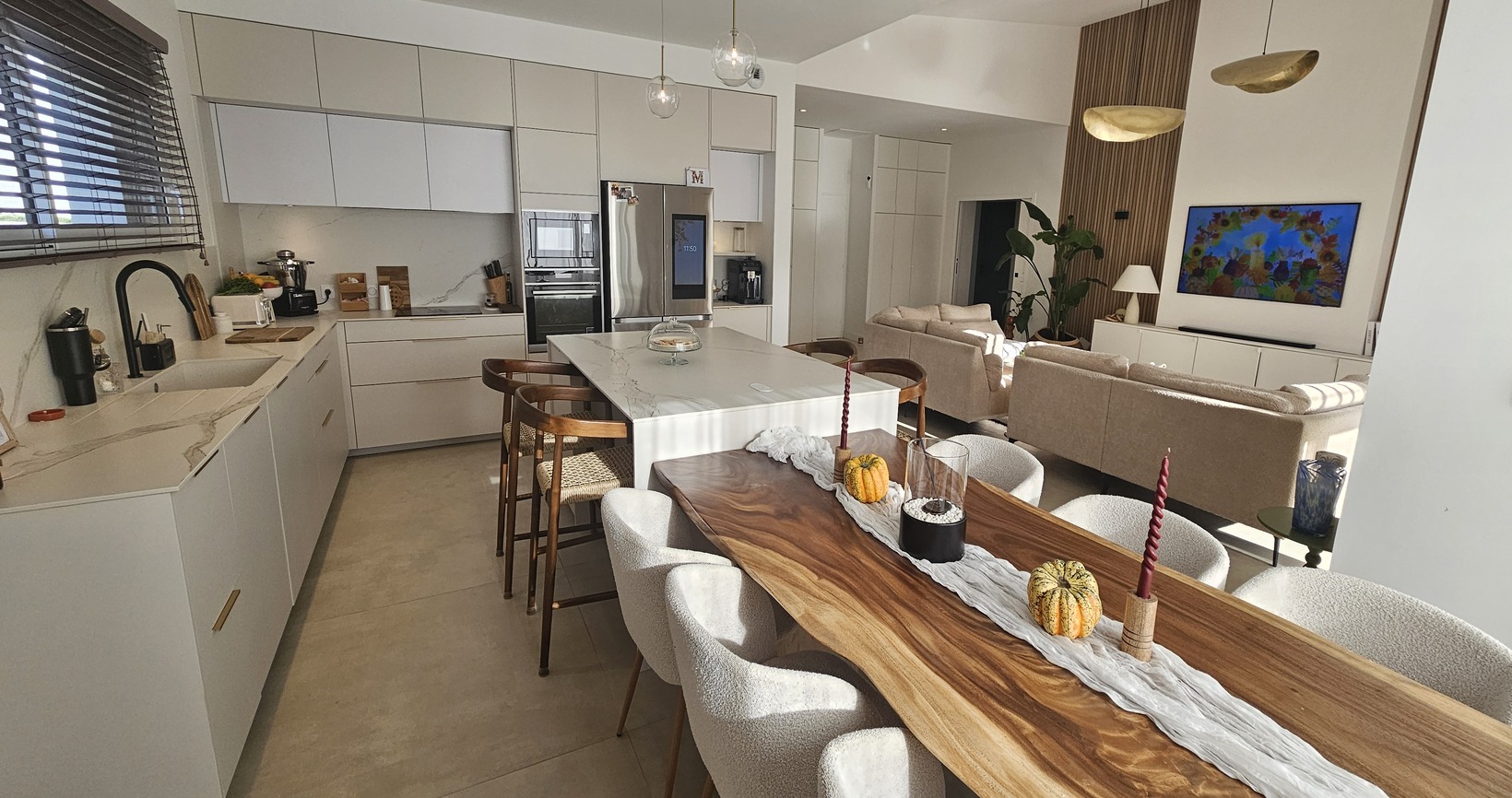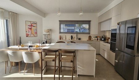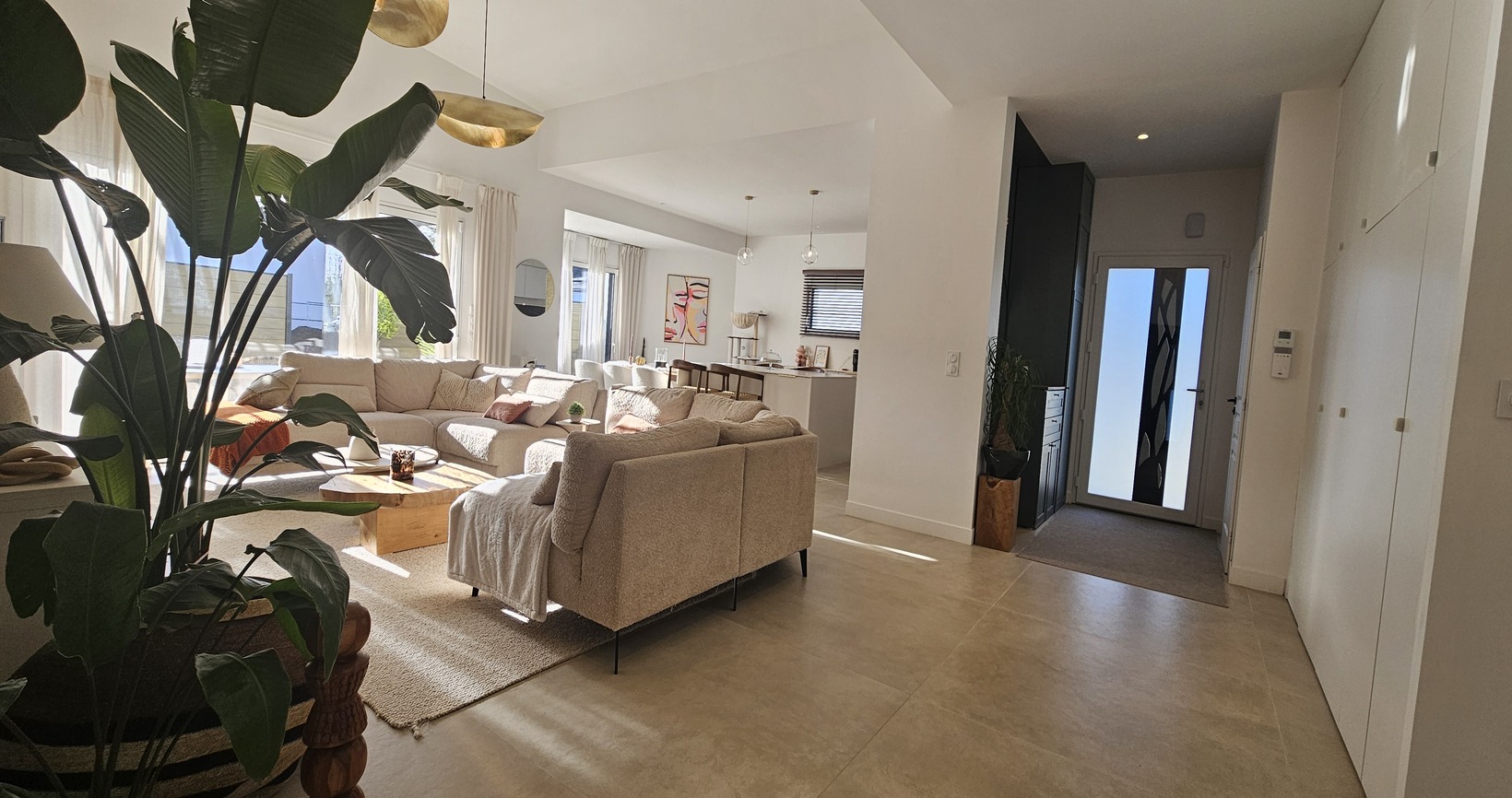 Dès l’entrée, généreusement équipée de rangements sur mesure, la visite révèle une maison pensée pour le confort du quotidien. La pièce de vie, sublimée par une Belle Hauteur sous Plafond, offre 67 m² d’ouverture et de fluidité. Le carrelage grand format 120×120 renforce l’élégance de l’ensemble, tandis que les larges ouvertures aluminium diffusent une lumière constante toute la journée. La cuisine haut de gamme, entièrement aménagée et équipée, s’intègre naturellement dans l’espace dinatoire, créant une ambiance conviviale et moderne.