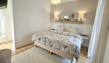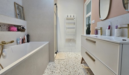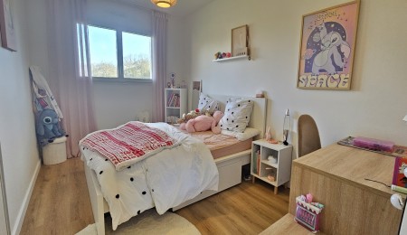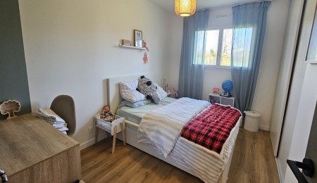 À l’extérieur, la terrasse plein Sud en béton prolonge agréablement les espaces de vie. Le jardin, en cours de finition, offre un beau potentiel d’aménagement, en attendant la pousse des futures haies. L’ensemble bénéficie d’un chauffage au sol par pompe à chaleur air/eau.