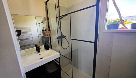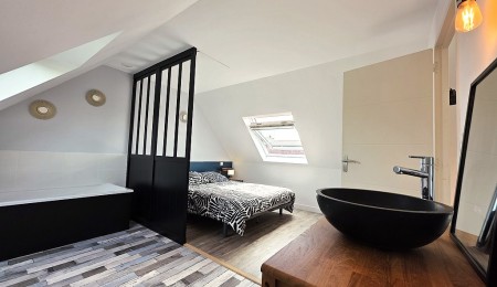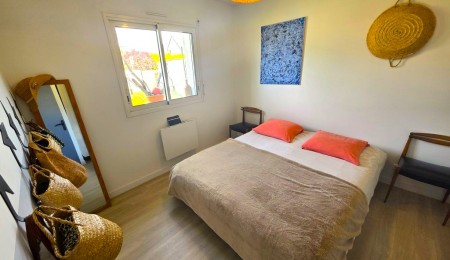 Une entrée formant un sas chaleureux et fonctionnel, avec espace cellier- buanderie. En prolongement une vaste pièce de vie lumineuse et conviviale propose un salon- séjour donnant sur le jardin et cuisine ouverte parfaitement aménagée et équipée . A proximité, une chambre à “l’esprit cosy” avec rangement ; une salle d’eau et un wc offrent le confort tant recherché pour une vie idéale de plain -pied . A l’étage , un palier dessert deux grandes chambres, dont une ( 16 m²) intégrant une élégante salle de bains au style atelier avec verrière; puis un wc indépendant.