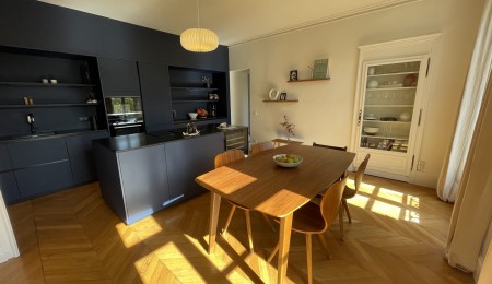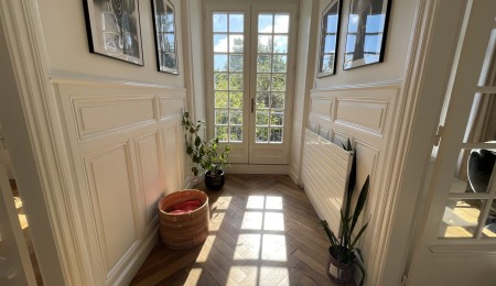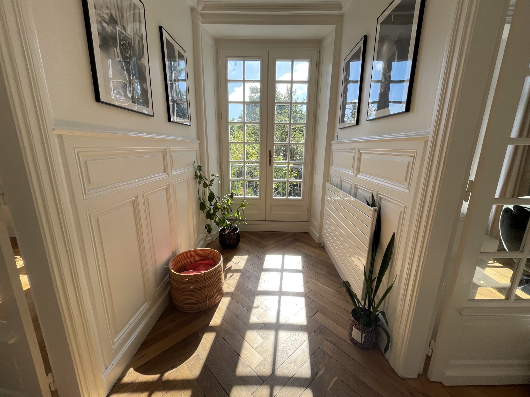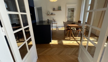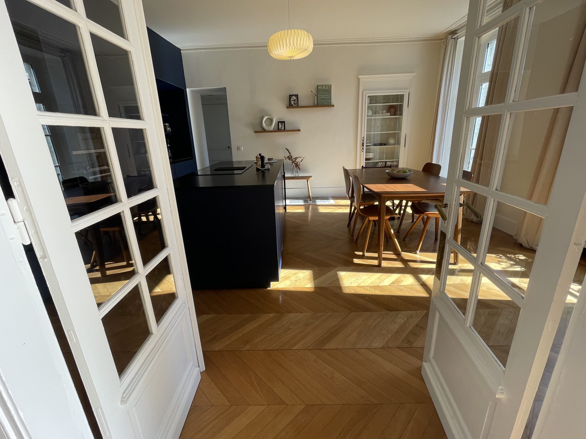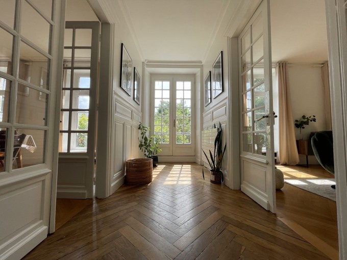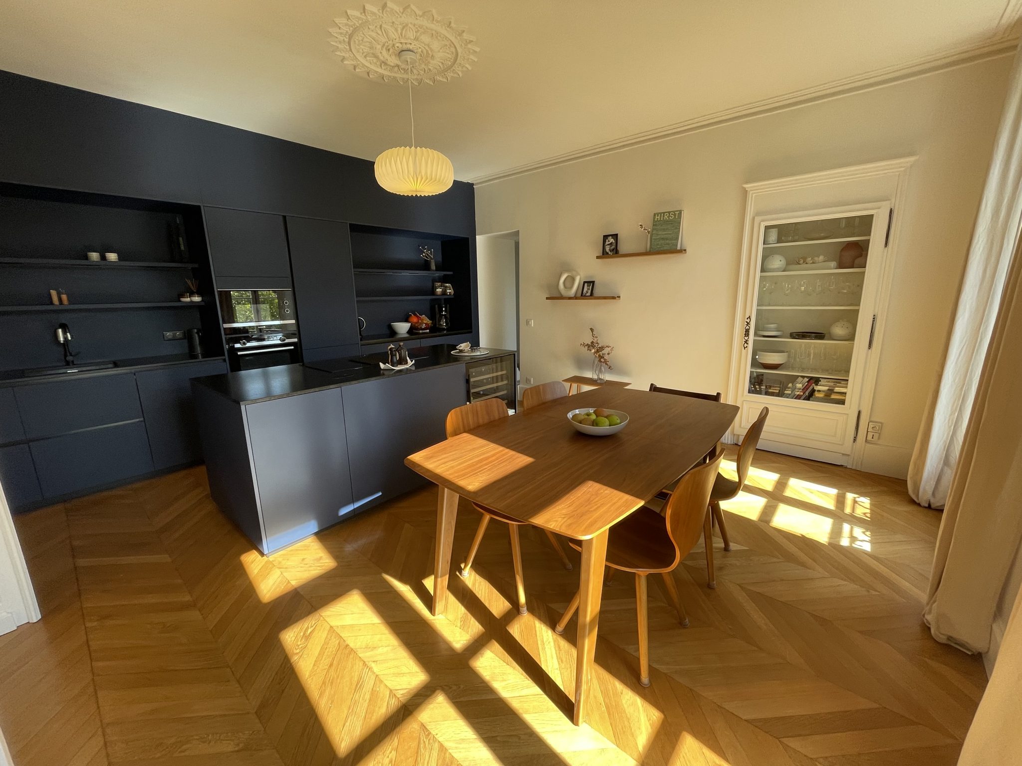 Belle hauteur sous plafonds, cheminée en marbre, boiserie d’époque, Parquet à chevrons …).Une lumineuse pièce de vie sur parquet massif , une vaste cuisine dinatoire moderne aménagée et équipée de près de 30 m² , deux belles chambres , un bureau /cellier, salle d’eau , un W.C . Le must : un jardin privatif à l’abri des regards en complément d’un jardin collectif arboré , et une cour avec stationnement avec portail .