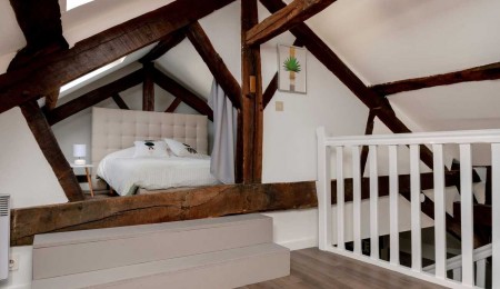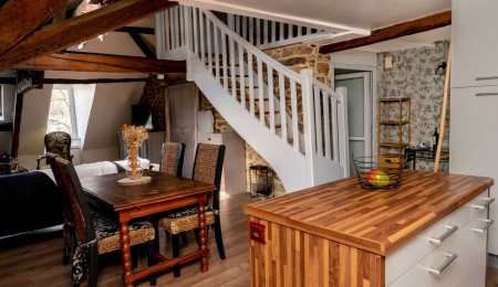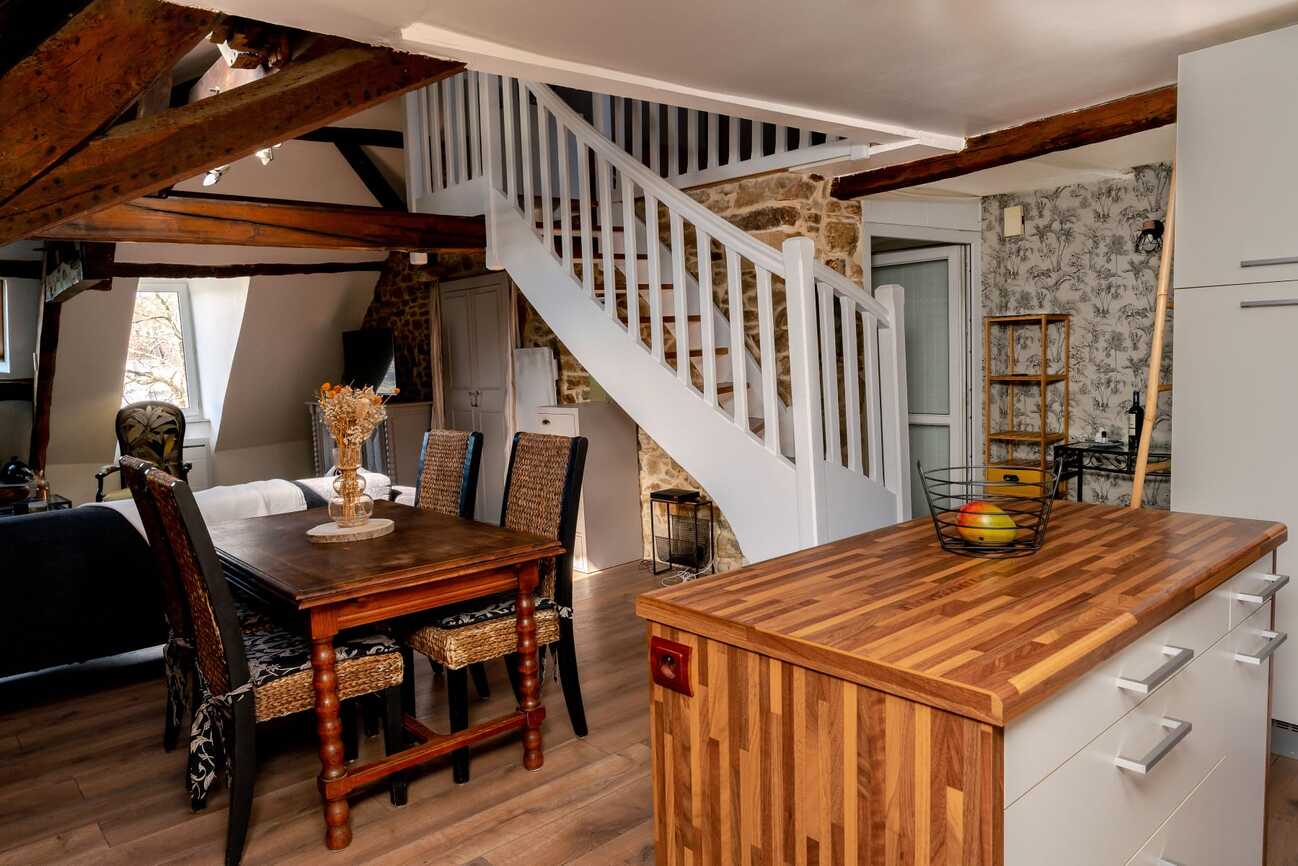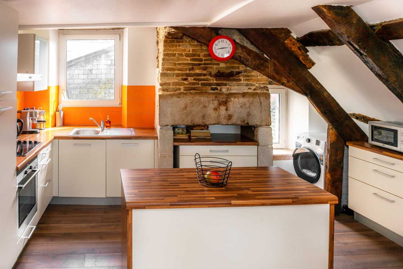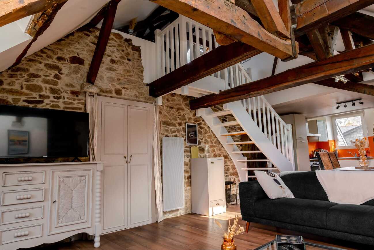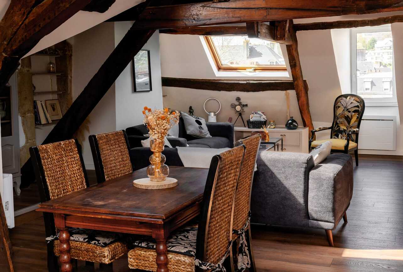 Quimper situé au cœur du centre-ville dans un immeuble ancien entièrement rénové, ce superbe appartement en duplex offre une surface d’environ 115 m² au sol (dont 79,55 m² Loi Carrez) et bénéficie d’une vue imprenable sur l’Odet. Dès l’entrée, vous serez séduit par le charme des parquets anciens, ses murs en pierre et la belle hauteur sous plafond… Une atmosphère chaleureuse et pleine de caractère. L’appartement se compose d’une grande entrée avec un palier, d’un espace de vie avec vue sur l’odet, ancienne cheminée et espaces de rangement, d’une cuisine aménagée équipée, de deux chambres, d’une salle de bains moderne et de WC séparés. À l’étage, une mezzanine aménagée en bureau offre un espace idéal pour le télétravail ou la détente, complétée par une chambre supplémentaire. Un bien rare alliant cachet de l’ancien, confort et emplacement privilégié. Accès commerces et transports à pied, stationnement gratuit à proximité (100 m).