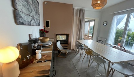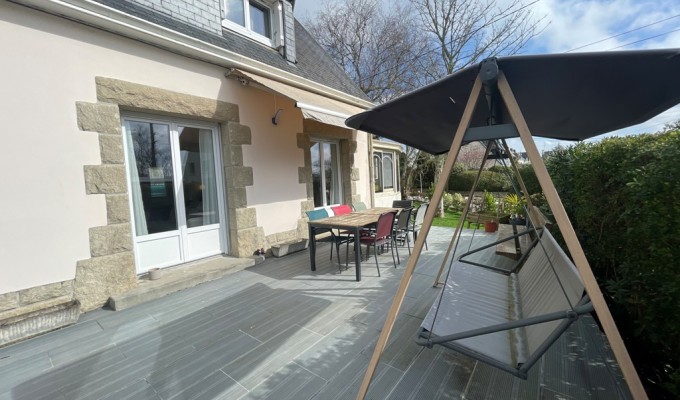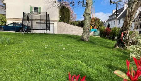 Exclusivité Agence. Quimper dans le quartier prisé de “Kerfeunteun” à quelques encablures du centre ville et à proximité des commerces et des écoles. Dans une ruelle au calme coquette maison des années 1970 entièrement Rénovée avec goût dans une ambiance Cosy pour une surface généreuse de 150 m². Hall d’entrée desservant une belle pièce de vie BAIGNEE DE LUMIERE donnant directement sur une terrasse agrémenté d’une véranda. Cuisine A/E , bureau, w-c, garage et buanderie. A l’étage sur parquet, 4 chambres dont une avec salle d’eau privative, salle de bain complémentaires, w-c Nombreux rangements. Un jardin clos et arboré de 450 m² en vie de plain-pied. A découvrir rapidement pour une maison familiale de qualité. Posez vos meubles.