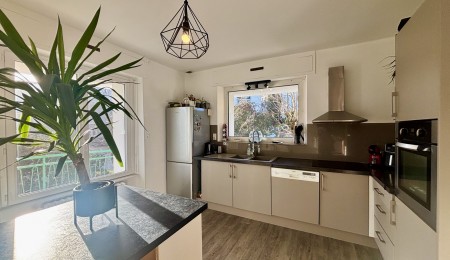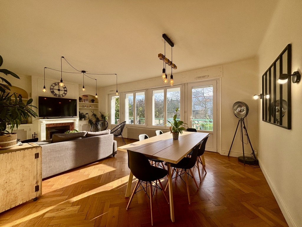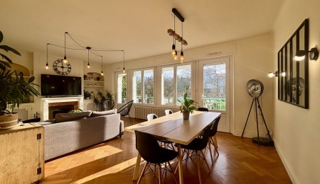 Elle propose une cuisine indépendante aménagée et équipée, idéale pour les amateurs de cuisine, ainsi qu’un vaste salon chaleureux avec cheminée à bois, parfait pour partager des moments précieux en famille ou entre amis. De larges ouvertures prolongent les espaces de vie vers un balcon filant, apportant une sensation d’ouverture et de liberté.