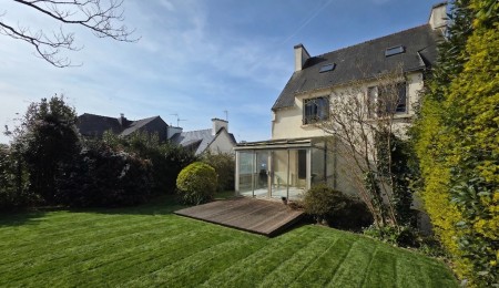 Quimper, située dans une impasse du Quartier si courtisé du “Frugy”, découvrez cette vaste Maison de Famille (155 m²) offrant en rez de chaussée une entrée desservant une lingerie et un grand garage facile d’accès avec sa porte motorisée, En rez de jardin le palier dessert un beau salon double avec cheminée exposé sud et ouest avec un balcon et une salle à manger avec une cuisine aménagée et équipée agrandie d’une véranda donnant sur le jardin paysagé exposé Sud et Est, une salle d’eau, un wc; Au premier étage: 4 chambres, une salle d’eau un wc; Au dernier étage sous mansarde un palier desservant un dressing, une grande chambre offrant une vue sur la ville et la baie de Kérogan!