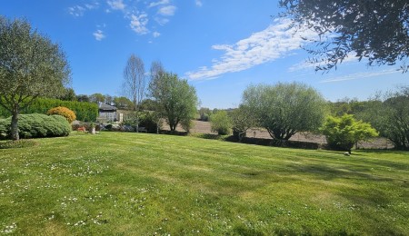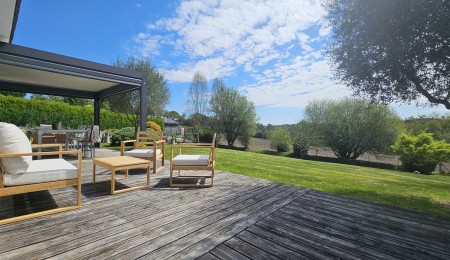 À l’extérieur, la terrasse en bois neuve se prolonge vers la Piscine Chauffée 4×8, parfaitement intégrée dans son environnement. La Vue Dégagée sur la Campagne, sans vis-à-vis, le jardin paysagé, le carport, la pergola et le garage ajoutent confort et praticité à ce cadre de vie recherché.