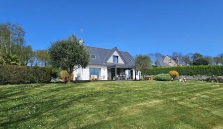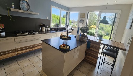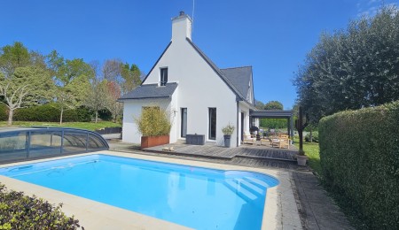 Quimper, sur la route des Plages, cette Contemporaine Familiale dévoile une atmosphère Chaleureuse avec Piscine Chauffée 4×8. Dès l’entrée, portée par de Beaux Volumes Baignés de Lumière et une vue dégagée sur la campagne environnante. Implantée sur un terrain paysagé de près de 2800 m², elle offre un parfait équilibre entre confort moderne, intimité et vie extérieure soignée.
