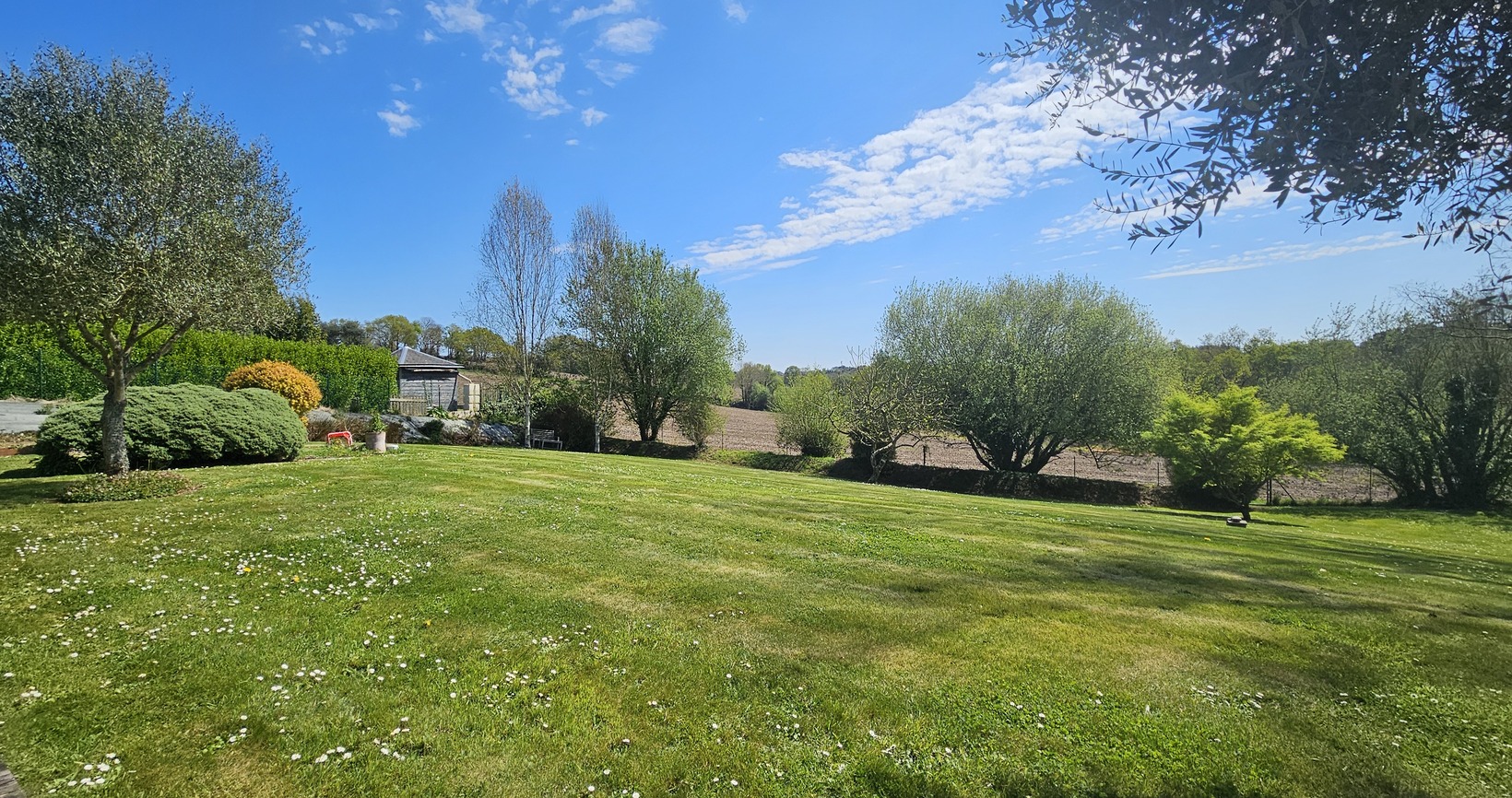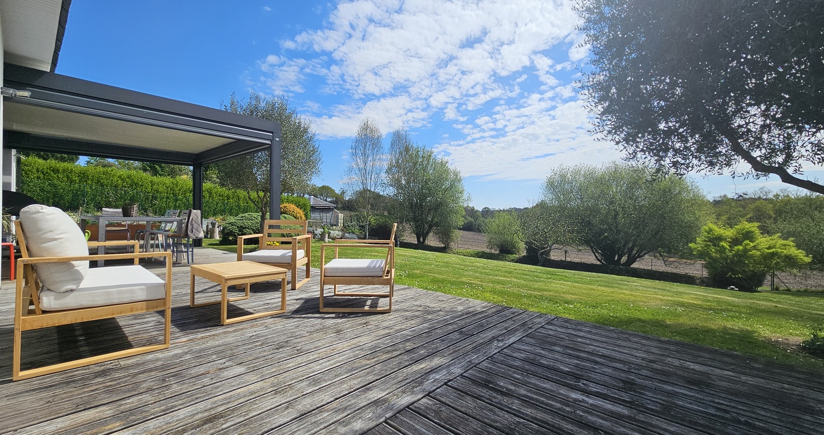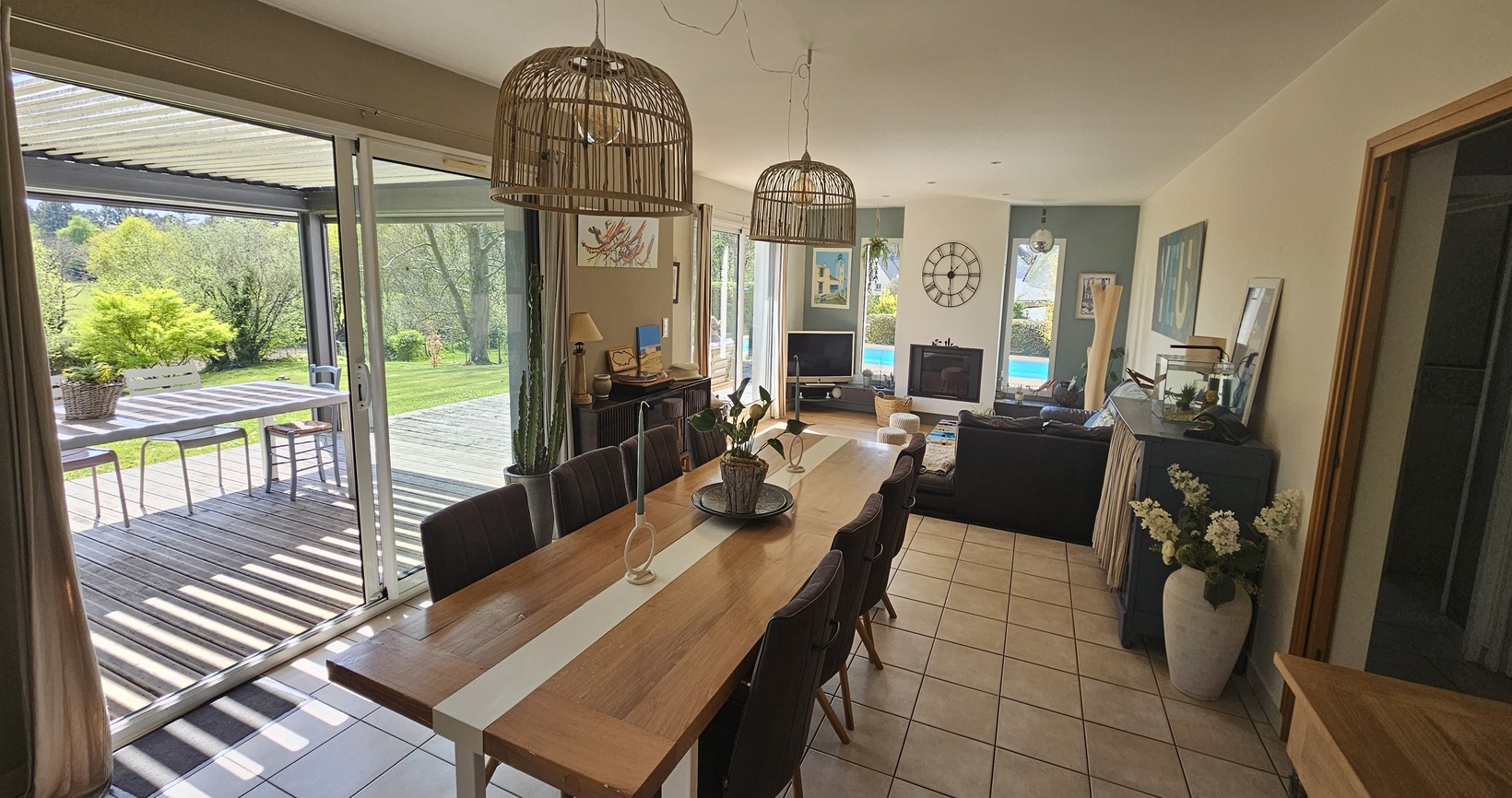 À l’extérieur, la terrasse en bois neuve se prolonge vers la Piscine Chauffée 4×8, parfaitement intégrée dans son environnement. La Vue Dégagée sur la Campagne, sans vis-à-vis, le jardin paysagé, le carport, la pergola et le garage ajoutent confort et praticité à ce cadre de vie recherché.