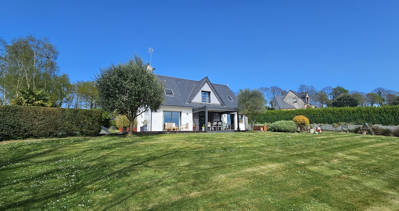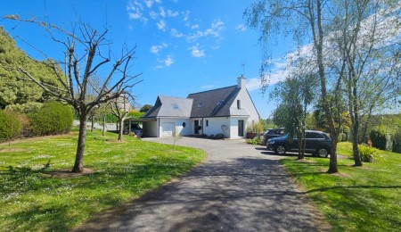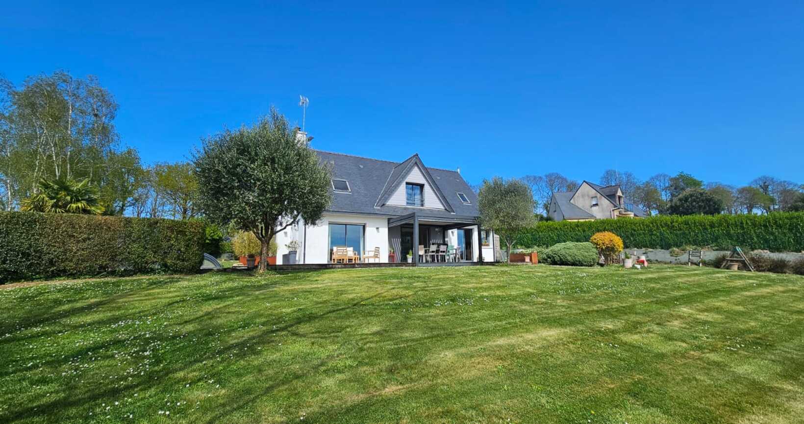 Quimper, sur la route des Plages, cette Contemporaine Familiale dévoile une atmosphère Chaleureuse avec Piscine Chauffée 4×8. Dès l’entrée, portée par de Beaux Volumes Baignés de Lumière et une vue dégagée sur la campagne environnante. Implantée sur un terrain paysagé de près de 2800 m², elle offre un parfait équilibre entre confort moderne, intimité et vie extérieure soignée.