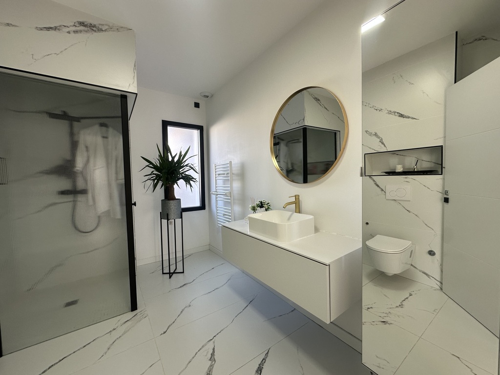 Côté nuit, la maison se divise en deux espaces distincts. La suite parentale, véritable cocon, s’ouvre directement sur le jardin et bénéficie d’un dressing sur mesure et d’une salle d’eau privative avec WC. Trois autres chambres lumineuses se partagent une élégante salle de bain équipée également de WC. Chaque détail a été imaginé pour offrir confort, harmonie et praticité au quotidien.