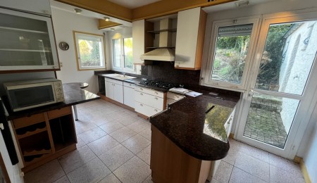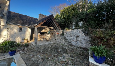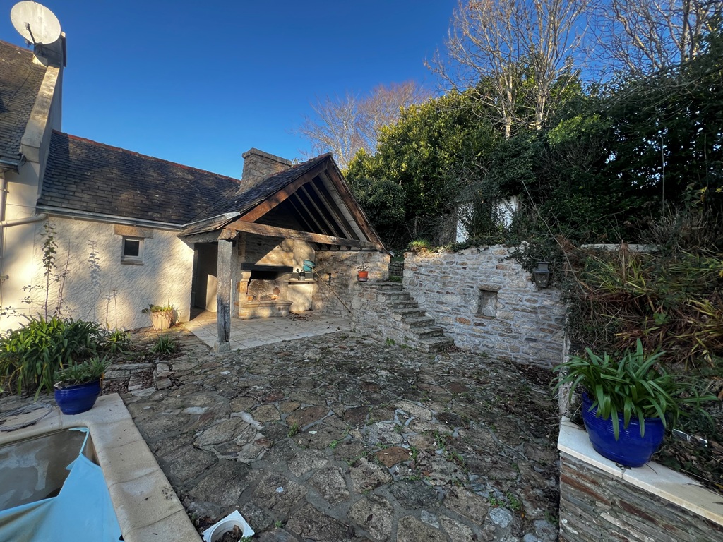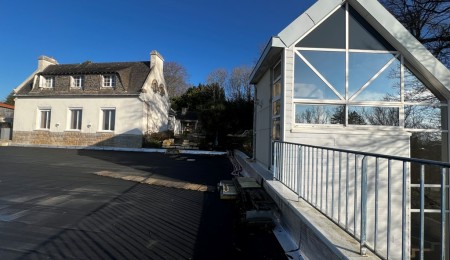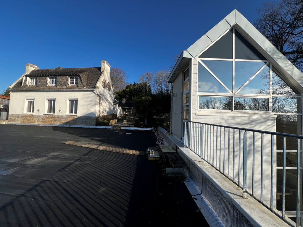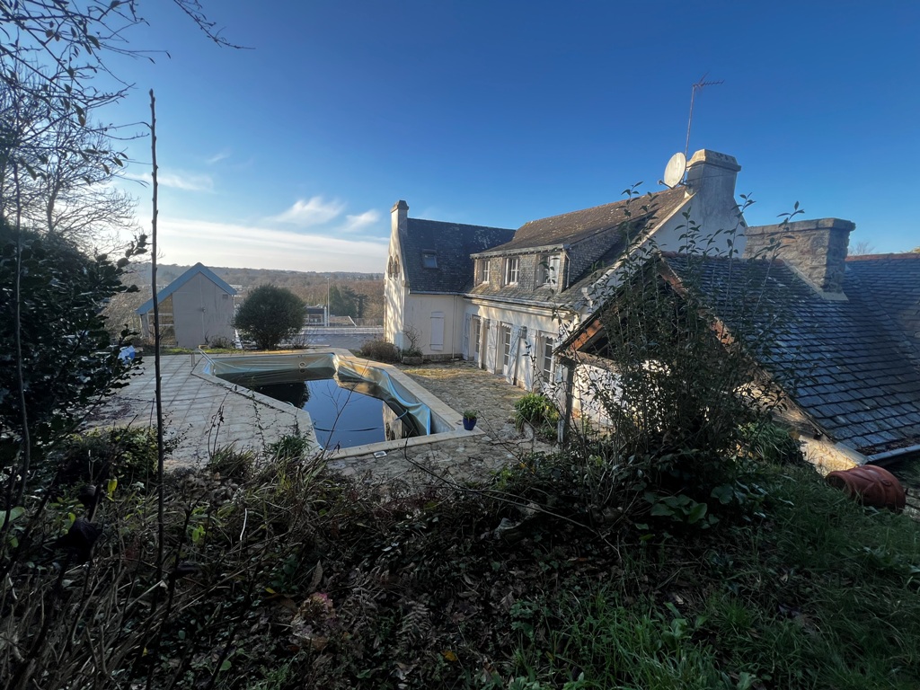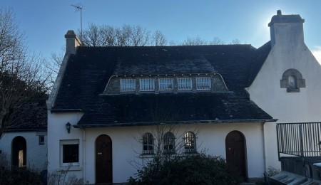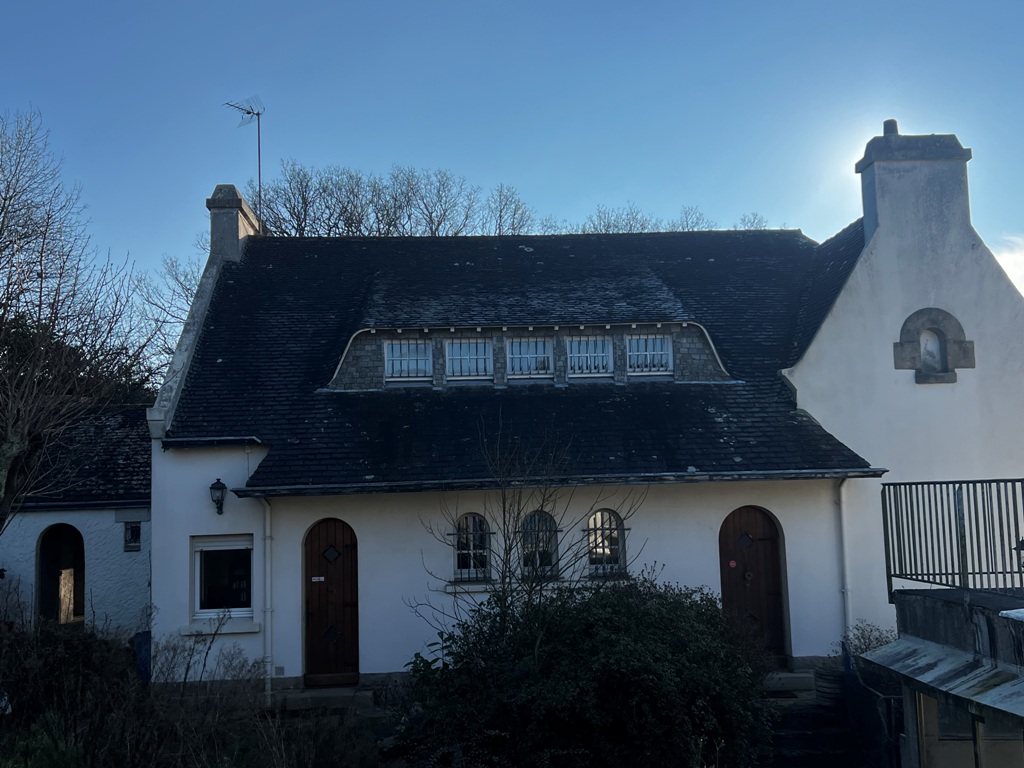 Quimper Sud Route des plages. Caché pour mieux se révéler sur les hauteurs de la “Baie de Kérogan”, l’intemporelle Maison de caractère de 218 m² ne demandant qu’une Seconde Jeunesse. Bâtie dans les années 1970 sur sous sol complet en béton banché, offrant des matériaux de haute couture de l’époque (parquet pointe de Hongrie, corniche en staff, cheminée en marbre blanc, ardoise authentique) répartie sur deux niveaux et desservie par un ascenseur privatif offrant le caractère authentique des lieux par son accès et sa distribution.