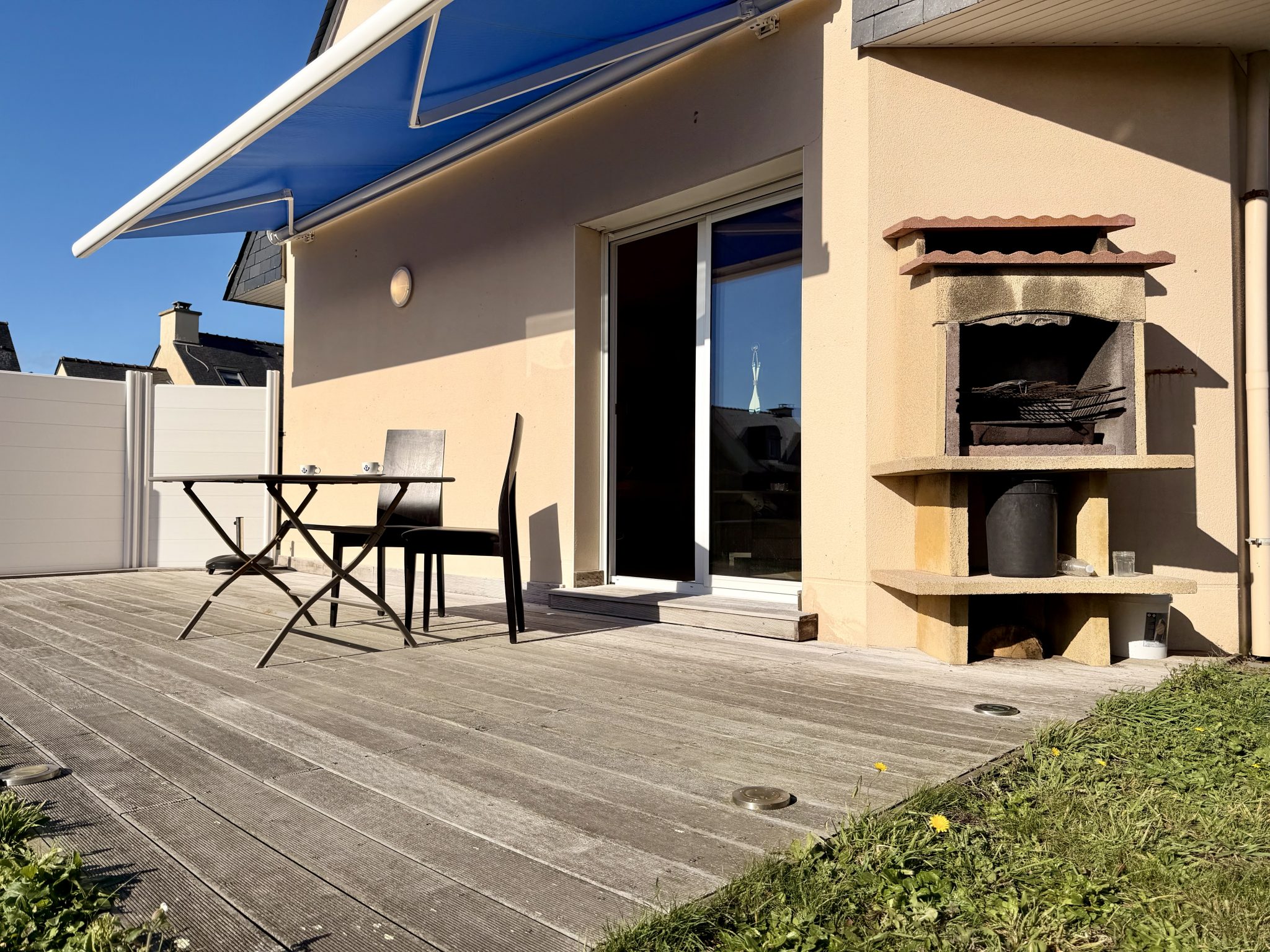 À l’extérieur, vous profiterez d’un agréable jardin entièrement clos, idéal pour la détente et les repas d’été. Une grande terrasse équipée d’un store banne et d’un barbecue maçonné prolonge harmonieusement l’espace de vie.