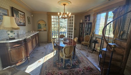 D’une superficie d’environ 226 m² habitables, la maison offre de beaux volumes et des matériaux de qualité. Au rez-de-chaussée, vous découvrirez une entrée accueillante, une chambre, ainsi qu’un vaste salon-séjour traversant et lumineux de 60 m² ouvrant sur une terrasse exposée plein sud, idéale pour profiter des beaux jours. Le séjour se distingue par son sol en marbre, apportant élégance et cachet. Une salle à manger avec balcon et vue sur la rivière, habillée d’un sol en pierre de Bourgogne, prolonge agréablement l’espace de réception. Une grande cuisine aménagée et équipée, fonctionnelle, ainsi qu’une salle d’eau et une WC indépendant complètent ce niveau.